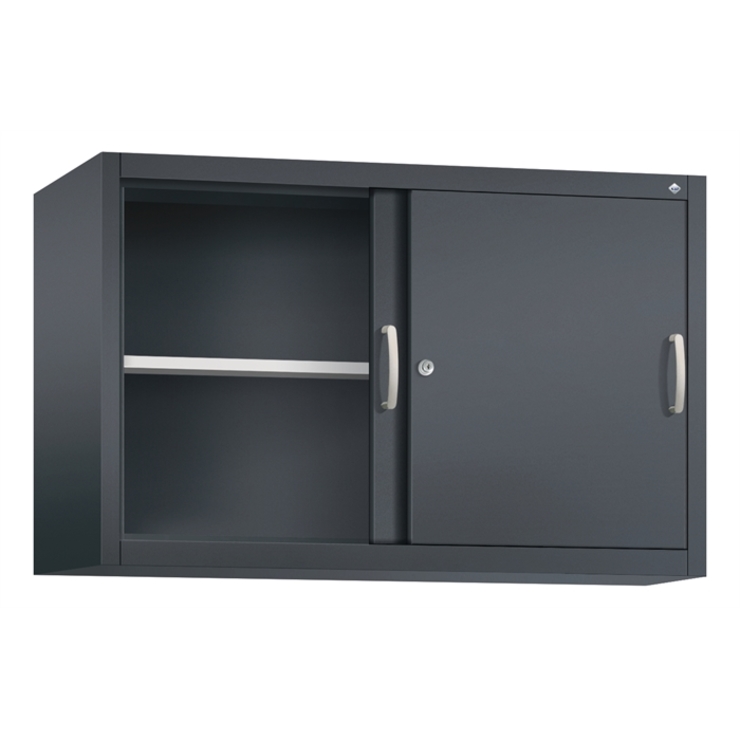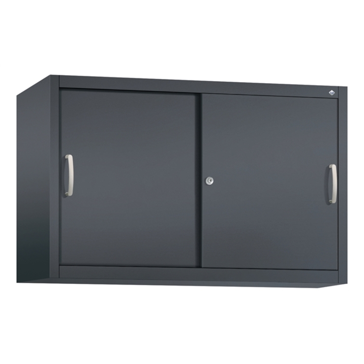 Stahl-Schiebetürenschrank Acurado-2000, als Aufsatzschrank, Korpus aus stabiler Stahlkonstruktion mit hochwertiger Einbrennbeschichtung für hohe UV-Beständigkeit, mit Kunststoffgleitern als praktischer Schrank- und Fußbodenschutz, hohe Flexibilität der Inneneinrichtung durch Höhenverstellbarkeit im 15 mm Raster, Türen verstärkt für hohe Stabilität, leichtgängige Bedienung durch Leichtlaufrollen in spezieller Schienenführung, 1 Wechselzylinder matt vernickelt mit 2 Schlüsseln, 2 Ergonomische Bügelgriffe Ergolock aus Metall für einfache Bedienung, matt vernickelt, 1 Einlegeboden aus Stahl, lackiert, mit hoher Traglast 70 kg, Maße (H x B x T): 790 x 1200 x 400 mm, Korpus: RAL 7021 Schwarzgrau, Türen: RAL 7021 Schwarzgrau, Inneneinrichtung: RAL 7035 Lichtgrau