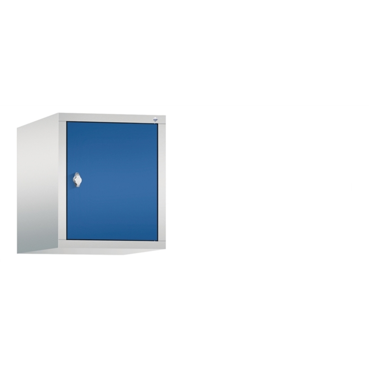 Stahl-Fächerschrank Classic, als Aufsatzschrank, 1 Abteil, Abteilbreite 400 mm, Türaufhängung oben und unten in Drehbolzen, rechts angeschlagen, 1 Drehriegel für Vorhangschloss, Maße (H x B x T): 500 x 420 x 500 mm, Korpus: RAL 7035 Lichtgrau, Türen Stahl: RAL 5010 Enzianblau
