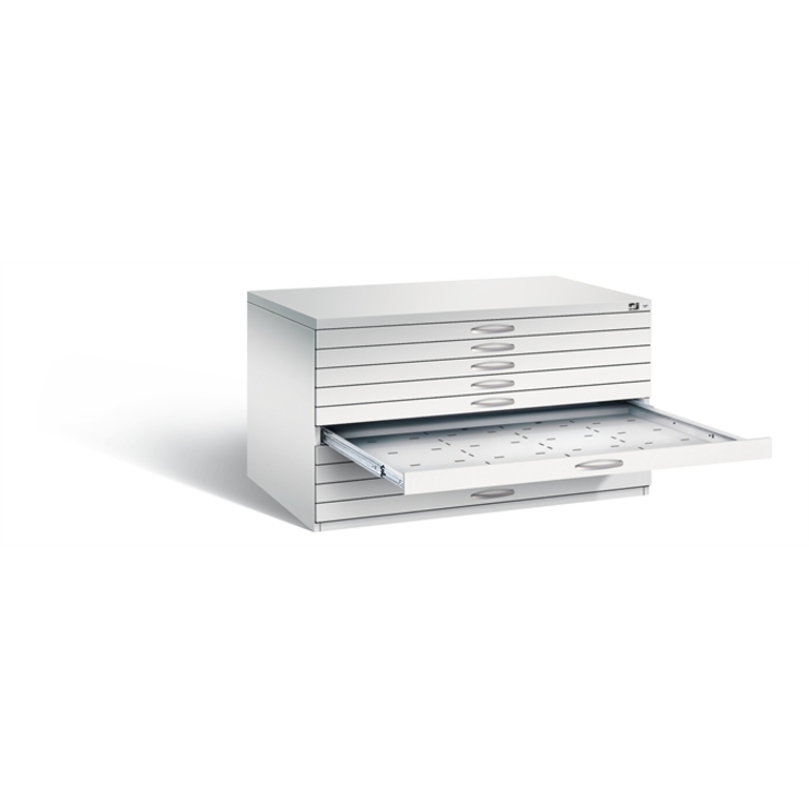 Stahl-Schubladenschrank Serie 7100_7200, als Flachablageschrank, Korpus aus stabiler Stahlkonstruktion mit hochwertiger Einbrennbeschichtung für hohe UV-Beständigkeit, mit Kunststoffgleitern als praktischer Schrank- und Fußbodenschutz, 1 Zentralverschluss mit Druckzylinderschloss und 2 Schlüsseln, 10 Ergonomische Bügelgriffe Ergolock aus Metall für einfache Bedienung, matt vernickelt, 10 Schubladen 4/5 ausziehbar, 45 mm hoch, gerastert und unterteilbar für Formate bis DIN A0, hinten mit Deckleiste und vorne mit schwenkbarem Niederhalter, auf langlebigen 2-fach Teleskopschienen mit hoher Traglast von 40 Kg, inkl. Auszugsperre und End-Selbst-Einzug, 10 Schubladenblenden doppelwandig, 66 mm hoch für lichte Schubladen-Nutzhöhe von 55 mm, 10 hochwertige Etikettenrahmen aus Kunststoff, selbstklebend, inkl. weißem Beschriftungsschild, Maße (H x B x T): 760 x 1350 x 960 mm, Korpus: RAL 7035 Lichtgrau, Blenden: RAL 7035 Lichtgrau, Inneneinrichtung: RAL 7035 Lichtgrau