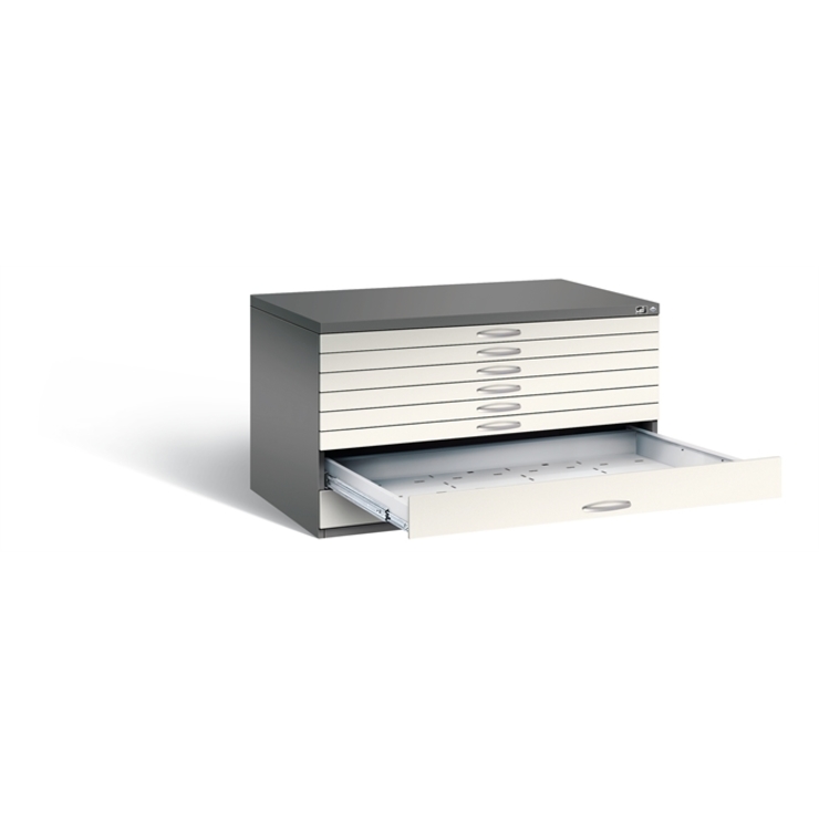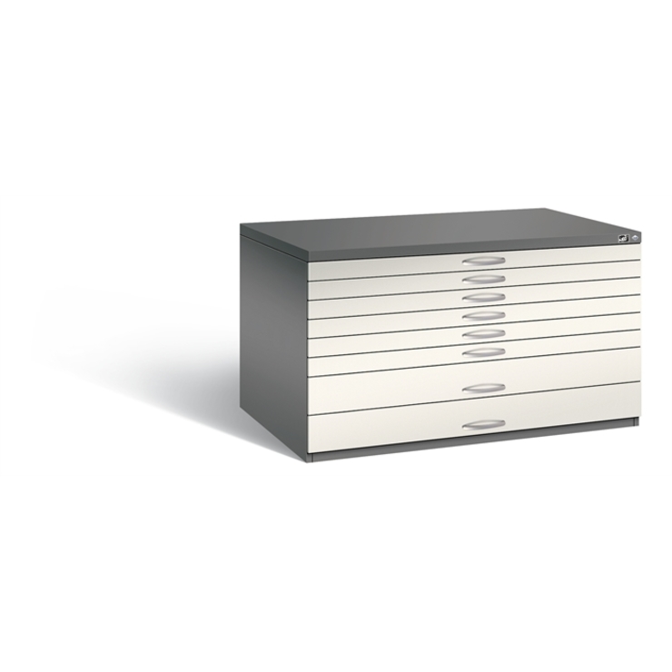 Stahl-Schubladenschrank Serie 7100_7200, als Flachablageschrank, Korpus aus stabiler Stahlkonstruktion mit hochwertiger Einbrennbeschichtung für hohe UV-Beständigkeit, mit Kunststoffgleitern als praktischer Schrank- und Fußbodenschutz, 1 Zentralverschluss mit Druckzylinderschloss und 2 Schlüsseln, 8 Ergonomische Bügelgriffe Ergolock aus Metall für einfache Bedienung, matt vernickelt, 8 Schubladen 4/5 ausziehbar, 45 mm hoch, gerastert und unterteilbar für Formate bis DIN A0, hinten mit Deckleiste und vorne mit schwenkbarem Niederhalter, auf langlebigen 2-fach Teleskopschienen mit hoher Traglast von 40 Kg, inkl. Auszugsperre und End-Selbst-Einzug, 6 Schubladenblenden doppelwandig, 66 mm hoch für lichte Schubladen-Nutzhöhe von 55 mm, 2 Schubladenblenden doppelwandig, 134 mm hoch für lichte Schubladen-Nutzhöhe von 120 mm, 8 hochwertige Etikettenrahmen aus Kunststoff, selbstklebend, inkl. weißem Beschriftungsschild, Maße (H x B x T): 760 x 1350 x 960 mm, Korpus: 0005000 RDS Vulkangrau, Blenden: RAL 1013 Perlweiß, Inneneinrichtung: RAL 7035 Lichtgrau