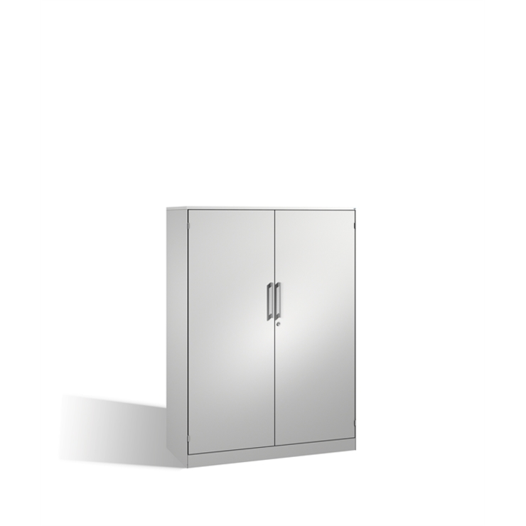 Stahl-Flügeltürenschrank Asisto, Korpus aus stabiler Stahlkonstruktion mit filigraner Kantenoptik und hochwertiger Einbrennbeschichtung für hohe UV-Beständigkeit, mit integrierter Niveauregulierung, bequem von innen bedienbar, hohe Flexibilität der Inneneinrichtung durch Höhenverstellbarkeit im 15 mm Raster, 1 Wechselzylinder matt vernickelt mit 2 Schlüsseln, 2 Ergonomische Design-Bügelgriffe für einfache Bedienung, aus Metall, matt vernickelt, 1 Abdeckplatte 25 mm aus direktbeschichteter Spanplatte (DBS), 2 Glastüren aus Einscheiben-Sicherheitsglas (ESG), Türaufhängung in innen liegenden Scharnieren mit großzügigem Öffnungswinkel ca. 225 Grad, zueinanderschlagend für gemeinsamen Verschluss, 3 Einlegeböden aus Stahl lackiert, mit hoher Traglast von 70 kg, Maße (H x B x T): 1635 x 1200 x 435 mm, Korpus: RAL 7035 Lichtgrau, Türen: RAL 7035 Lichtgrau, Inneneinrichtung: RAL 7021 Schwarzgrau, Abdeckplatte DBS: Dekor Hellgrau