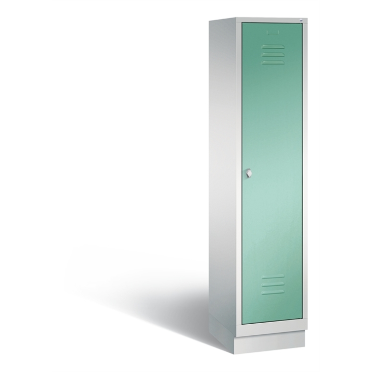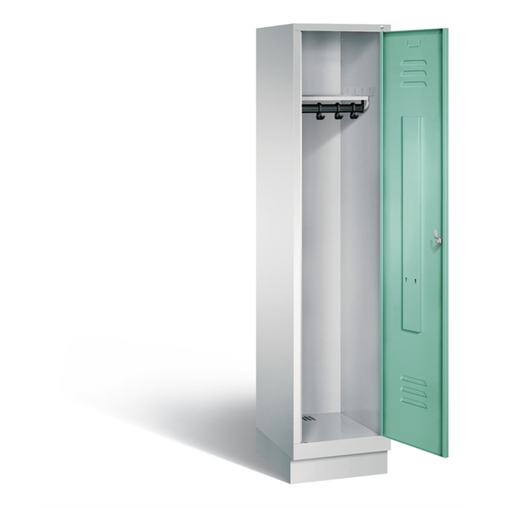 Stahl-Garderobenschrank Classic, 1 Abteil, Abteilbreite 400 mm, Korpus aus stabiler Stahlkonstruktion mit hochwertiger Einbrennbeschichtung für hohe UV- und Korrosionsbeständigkeit, innen je Abteil 1 Ablageboden, darunter 1 stabile Garderobenstange aus Ovalprofil mit 3 verdrehsicheren Schiebehaken, Schrankboden hinten mit Lüftungsöffnungen für optimale Luftzirkulation, auf 100 mm hohem Sockel, mit Kunststoffgleitern als praktischer Schrank- und Fußbodenschutz, vorne zurückgesetzt und oberhalb mit Luftdurchlass, 1 Drehriegel für Vorhangschloss, Tür mit Anschlagsdämpfer und mittiger Verstärkung für hohe Stabilität, mit Lüftungschlitzen oben und unten sowie eingestanztem Etikettenrahmen, Türaufhängung in Drehbolzen, Maße (H x B x T): 1800 x 420 x 500 mm, Korpus: RAL 7035 Lichtgrau, Türen Stahl: RAL 6027 Lichtgrün, Inneneinrichtung: RAL 7035 Lichtgrau