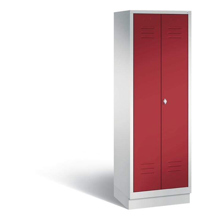 Stahl-Garderobenschrank Classic, mit verkürzter Mitteltrennwand, 2 Abteile, Abteilbreite 300 mm, Korpus aus stabiler Stahlkonstruktion mit hochwertiger Einbrennbeschichtung für hohe UV- und Korrosionsbeständigkeit, Türen zueinanderschlagend für gemeinsamen Verschluss, links 4 fest eingebaute Einlegeböden, stabile Garderobenstange aus Ovalprofil mit 6 verdrehsicheren Schiebehaken, auf 100 mm hohem Sockel, mit Kunststoffgleitern als praktischer Schrank- und Fußbodenschutz, vorne zurückgesetzt und oberhalb mit Luftdurchlass, 1 Drehriegel für Vorhangschloss, Türen mit Anschlagsdämpfer und mittiger Verstärkung für hohe Stabilität, mit Lüftungschlitzen oben und unten sowie eingestanztem Etikettenrahmen, Türaufhängung in Drehbolzen, Maße (H x B x T): 1800 x 610 x 500 mm, Korpus: RAL 7035 Lichtgrau, Türen Stahl: RAL 3003 Rubinrot