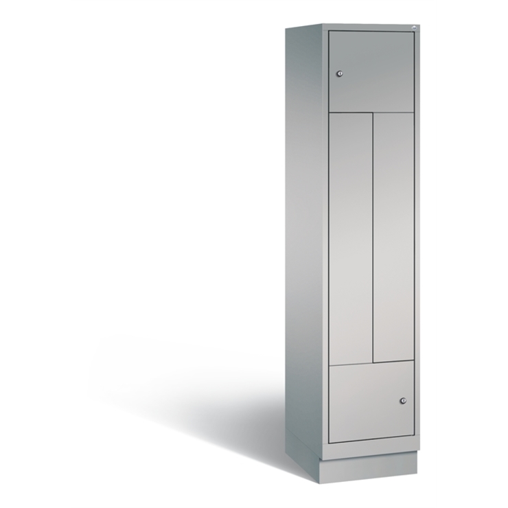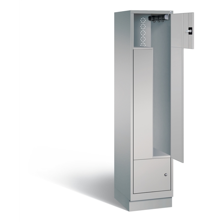 Stahl-Garderobenschrank Classic, 1 Abteil, Abteilbreite 400 mm, z-förmig unterteilt für 2 Personen, Korpus aus stabiler Stahlkonstruktion mit hochwertiger Einbrennbeschichtung für hohe UV- und Korrosionsbeständigkeit, innen komfortable Hängemöglichkeit langer Kleidungsstücke trotz geringem Platzangebot, je Fach 1 stabile Garderobenstange aus Ovalprofil mit 3 verdrehsicheren Schiebehaken, Z-Türen mit Anschlagsdämpfer, verstärkt für hohe Stabilität, Türaufhängung durchgängig mit robustem Drehstangen-Scharnier, mit Belüftungs-Lochbild in der Rückwand und 10 mm Wandabstandhalter, auf 100 mm hohem Sockel mit verstellbaren Bodengleitern für einfachen Niveauausgleich, 1 Zylinderschloss mit 2 Schlüsseln, Schließkreis bis 1000 verschiedene Schließungen, Maße (H x B x T): 1820 x 420 x 510 mm, Korpus: RAL 9006 Weißaluminium, Türen: RAL 9006 Weißaluminium, Inneneinrichtung: RAL 7035 Lichtgrau, Sockel: RAL 9006 Weißaluminium