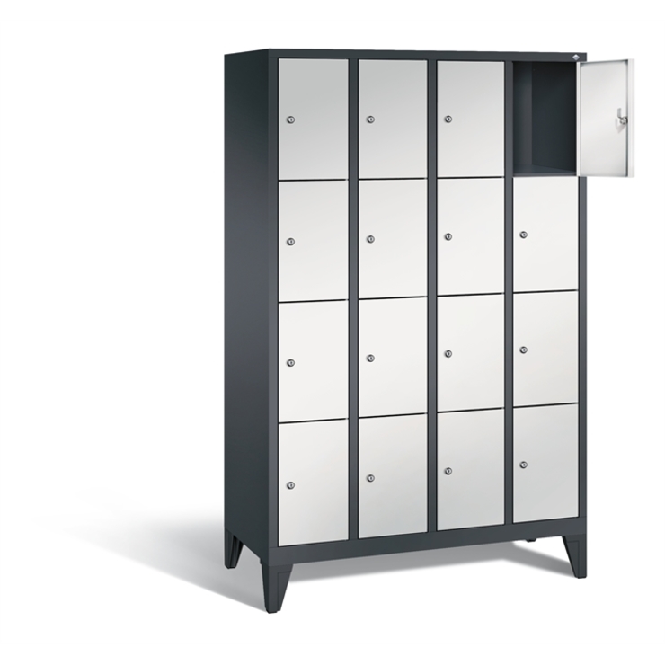 Stahl-Garderobenschrank Classic, 4 Abteile mit 4 Fächern, Abteilbreite 300 mm, Korpus aus stabiler Stahlkonstruktion mit hochwertiger Einbrennbeschichtung für hohe UV- und Korrosionsbeständigkeit, auf 150 mm hohen Füßen aus Kunststoff für erweiterten Korrosionsschutz, 16 Zylinderschlösser mit je 2 Schlüsseln, Schließkreis bis 1000 verschiedene Schließungen, Türen mit Anschlagsdämpfer, Türaufhängung in Drehbolzen, Maße (H x B x T): 1850 x 1190 x 500 mm, Korpus: RAL 7021 Schwarzgrau, Türen Stahl: RAL 7035 Lichtgrau, Füße: RAL 9005 Tiefschwarz