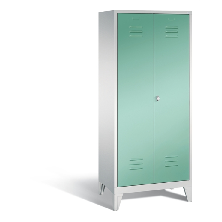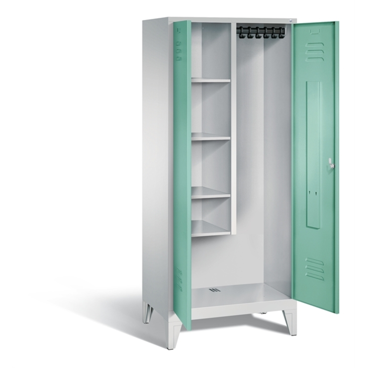 Stahl-Garderobenschrank Classic, mit verkürzter Mitteltrennwand, Abteilbreite 400 mm, Türen zueinanderschlagend für gemeinsamen Verschluss, Korpus aus stabiler Stahlkonstruktion mit hochwertiger Einbrennbeschichtung für hohe UV- und Korrosionsbeständigkeit, links 4 fest eingebaute Einlegeböden, stabile Garderobenstange aus Ovalprofil mit 6 verdrehsicheren Schiebehaken, auf 150 mm hohen Füßen aus Kunststoff für optimalen Korrosionsschutz, 1 Drehriegel für Vorhangschloss, Türen mit Anschlagsdämpfer und mittiger Verstärkung für hohe Stabilität, mit Lüftungschlitzen oben und unten sowie eingestanztem Etikettenrahmen, Türaufhängung in Drehbolzen, Maße (H x B x T): 1850 x 810 x 500 mm, Korpus: RAL 7035 Lichtgrau, Türen Stahl: RAL 6027 Lichtgrün, Füße: RAL 7035 Lichtgrau