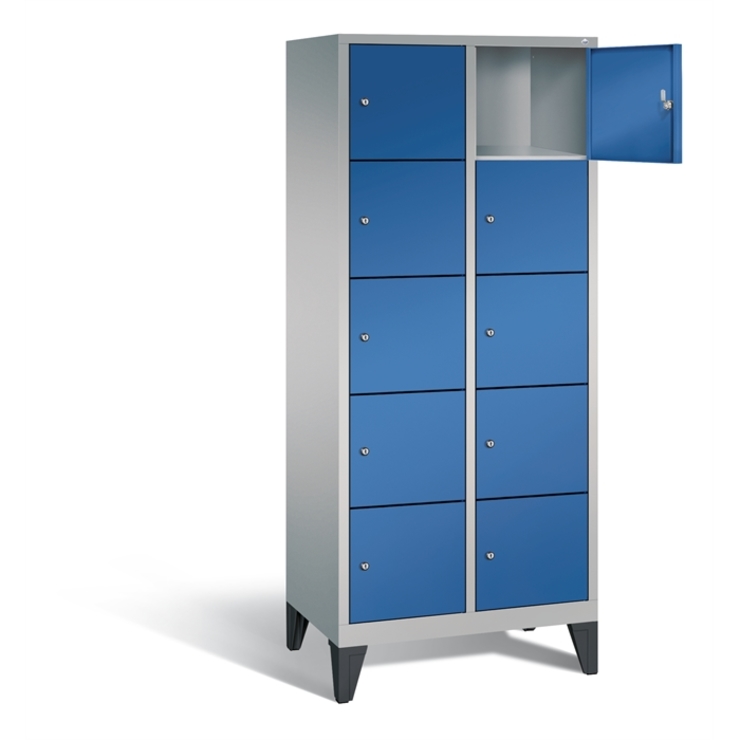 Stahl-Garderobenschrank Classic, 2 Abteile mit 5 Fächern, Abteilbreite 400 mm, Korpus aus stabiler Stahlkonstruktion mit hochwertiger Einbrennbeschichtung für hohe UV- und Korrosionsbeständigkeit, auf 150 mm hohen Füßen aus Kunststoff für erweiterten Korrosionsschutz, 10 Zylinderschlösser mit je 2 Schlüsseln, Schließkreis bis 1000 verschiedene Schließungen, Türen mit Anschlagsdämpfer, Türaufhängung in Drehbolzen, Maße (H x B x T): 1850 x 810 x 500 mm, Korpus: RAL 9006 Weißaluminium, Türen Stahl: RAL 5010 Enzianblau, Füße: RAL 9005 Tiefschwarz