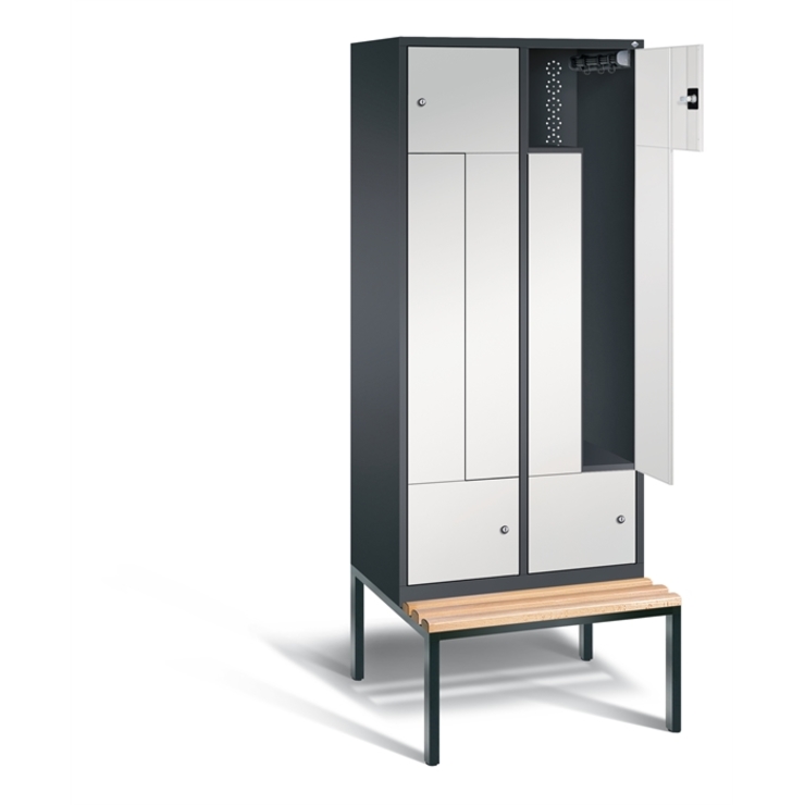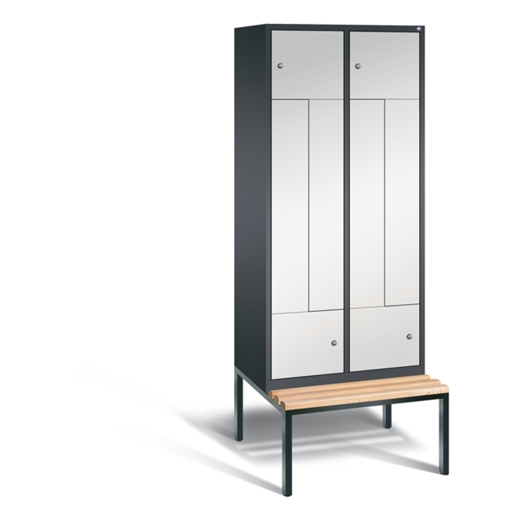 Doppelstöckiger Stahl-Garderobenschrank Evolo, 4 Abteile mit je 2 Fächern, Abteilbreite 300 mm, Korpus aus stabiler Stahlkonstruktion mit hochwertiger Einbrennbeschichtung für hohe UV- und Korrosionsbeständigkeit, innen je Fach 1 Ablageboden, darunter 1 stabile Garderobenstange aus Ovalprofil mit 3 verdrehsicheren Schiebehaken, auf untergebauter Sitzbank, Gestell aus stabilem Vierkant-Stahlrohr 30 x 30 mm, mit verstellbaren Bodengleitern für einfachen Niveauausgleich, 8 Ergonomische... (mehr)? Papersmart hilft Ihnen, den besten Anbieter für Ihren gesamten Warenkorb zu ermitteln.
