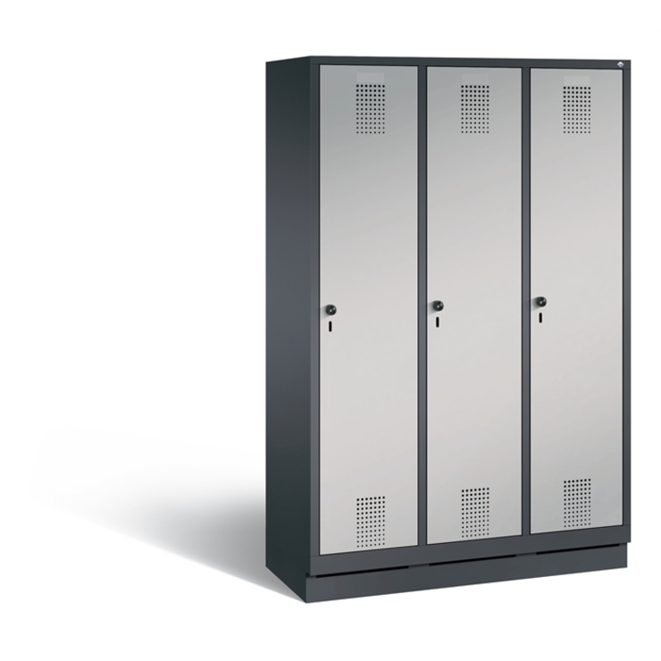 Stahl-Kombinations-Schließfachschrank Resisto, als Großraumschrank 3 Abteile mit 2 + 5 + 2 Fächern, Spezialtüren aus 1,5 mm Stahl, mit Wölbung nach vorne, absolut stabil und vandalismussicher, Türaufhängung durchgängig mit robustem Drehstangen-Scharnier, rechts angeschlagen, mit Belüftungs-Lochbild in der Rückwand und 20 mm Wandabstandhalter, auf 100 mm hohem Sockel mit 30 mm Niveauregulierung, innen pro großem Fach eine stabile Garderobenstange aus Ovalprofil mit 3 verdrehsicheren... (mehr)? Papersmart hilft Ihnen, den besten Anbieter für Ihren gesamten Warenkorb zu ermitteln.