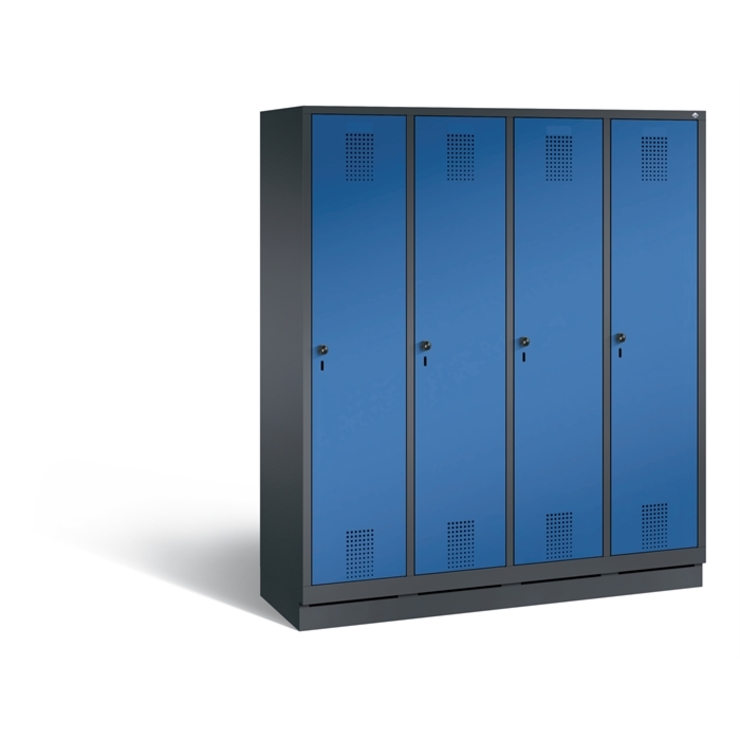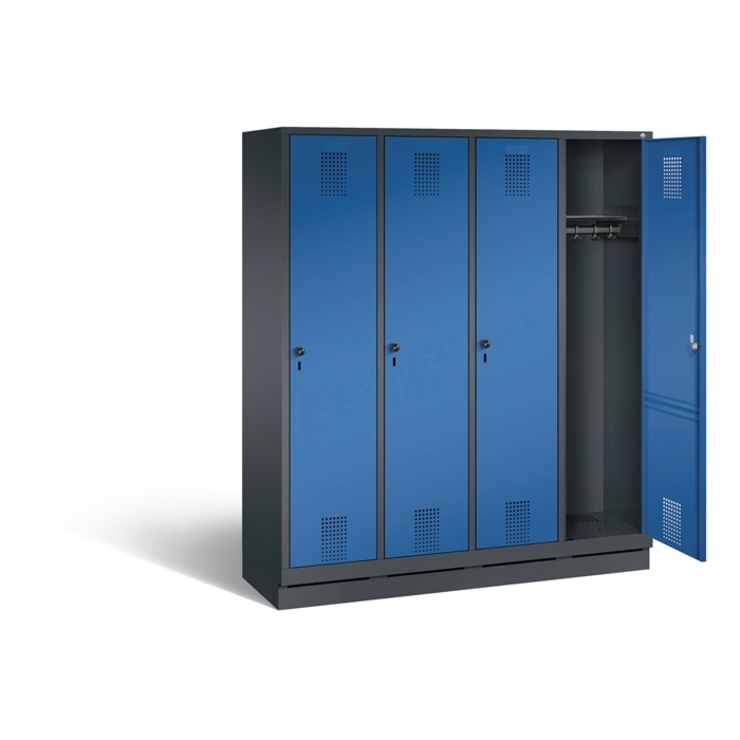 Stahl-Garderobenschrank Evolo, 2 Abteile, Abteilbreite 300 mm, Korpus aus stabiler Stahlkonstruktion mit hochwertiger Einbrennbeschichtung für hohe UV- und Korrosionsbeständigkeit, innen je Abteil 1 Ablageboden, darunter 1 stabile Garderobenstange aus Ovalprofil mit 3 verdrehsicheren Schiebehaken, Schrankboden hinten mit großflächigem Luftdurchlass für optimale Luftzirkulation, auf 150 mm hohen Füßen aus Kunststoff für erweiterten Korrosionsschutz, mit integrierter Niveauregulierung... (mehr)? Papersmart hilft Ihnen, den besten Anbieter für Ihren gesamten Warenkorb zu ermitteln.