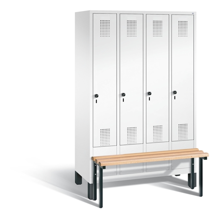 Stahl-Garderobenschrank Evolo, als Straßen- und Berufskleidungsschrank, 4 Abteile für 2 Personen, Abteilbreite 400 mm, Türen paarweise zueinanderschlagend für gemeinsamen Verschluss, Korpus aus stabiler Stahlkonstruktion mit hochwertiger Einbrennbeschichtung für hohe UV- und Korrosionsbeständigkeit, innen je Doppelabteil 1 durchgehender Ablageboden, darunter je Abteil 1 stabile Garderobenstange aus Ovalprofil mit 3 verdrehsicheren Schiebehaken, Schrankboden hinten mit großflächigem... (mehr)? Papersmart hilft Ihnen, den besten Anbieter für Ihren gesamten Warenkorb zu ermitteln.