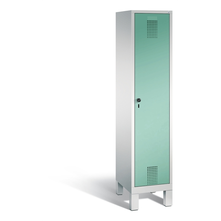 Stahl-Garderobenschrank Evolo, 1 Abteil, Abteilbreite 400 mm, Korpus aus stabiler Stahlkonstruktion mit hochwertiger Einbrennbeschichtung für hohe UV- und Korrosionsbeständigkeit, innen je Abteil 1 Ablageboden, darunter 1 stabile Garderobenstange aus Ovalprofil mit 3 verdrehsicheren Schiebehaken, Schrankboden hinten mit großflächigem Luftdurchlass für optimale Luftzirkulation, auf 150 mm hohen Füßen aus Kunststoff für erweiterten Korrosionsschutz, mit integrierter Niveauregulierung und Schutzhülsen zur stilvollen Abdeckung der Verstellschrauben, bequem von innen und außen verstellbar, 1 Ergonomischer Sicherheits-Drehriegel für Vorhangschloss inkl. Tür-Schutz, Tür mit Anschlagsdämpfer und geschlossenen Seitenprofilen für höchste Stabilität und Einbruchsicherheit, mit reinigungsfreundlichem Belüftungslochbild oben und unten sowie eingeprägtem Etikettenrahmen, Türaufhängung in Drehbolzen, Maße (H x B x T): 1850 x 420 x 500 mm, Korpus: RAL 7035 Lichtgrau, Türen Stahl: RAL 6027 Lichtgrün, Füße: RAL 7035 Lichtgrau, Inneneinrichtung: RAL 7021 Schwarzgrau
