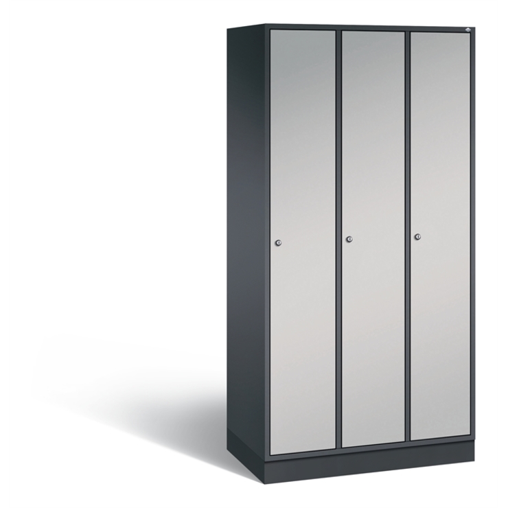 Stahl-Garderobenschrank Intro, 3 Abteile, Abteilbreite 300 mm, Korpus aus stabiler Stahlkonstruktion mit hochwertiger Einbrennbeschichtung für hohe UV- und Korrosionsbeständigkeit, Türen verstärkt für hohe Stabilität mit Anschlagsdämpfer, Türaufhängung durchgängig mit robustem Scharnierband, rechts angeschlagen, innen je Abteil 1 Ablageboden und 1 stabile Garderobenstange aus Ovalprofil mit 3 verdrehsicheren Schiebehaken, mit Belüftungslochbild in der Rückwand und 18 mm Wandabstandshaltern, auf 100 mm hohem Sockel, 3 Zylinderschlösser mit je 2 Schlüsseln, Schließkreis bis 1000 verschiedene Schließungen, Maße (H x B x T): 1950 x 920 x 490 mm, Korpus: RAL 7021 Schwarzgrau, Türen: RAL 9006 Weißaluminium, Sockel: RAL 7021 Schwarzgrau