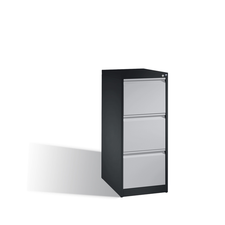 Stahl-Schubladenschrank Acurado, als Hängeregistraturschrank, Korpus aus stabiler Stahlkonstruktion mit hochwertiger Einbrennbeschichtung für hohe UV-Beständigkeit, 3 voll ausziehbare Schubladen mit integrierter durchgehender Griffleiste, 1- bahnig, für Hängehefter DIN A4, Schubladenwannen lackiert, auf langlebigen 2-fach Teleskopschienen mit hoher Traglast von 50 Kg je Schub, inkl. Auszugsperre, Zentralverschluss, 1 Wechselzylinder matt vernickelt mit 2 Schlüsseln, 3 hochwertige Etikettenrahmen aus Kunststoff, selbstklebend, inkl. weißem Beschriftungsschild, Maße (H x B x T): 1045 x 433 x 590 mm, Korpus: RAL 7021 Schwarzgrau, Blenden: RAL 9006 Weißaluminium, Inneneinrichtung: RAL 7035 Lichtgrau