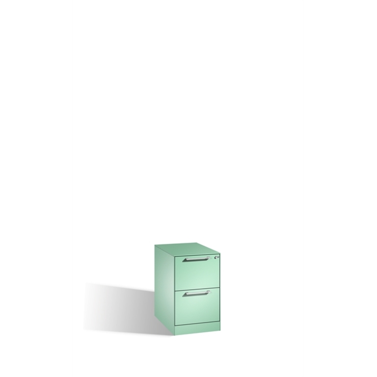 Stahl-Schubladenschrank Asisto, als Hängeregistraturschrank, Korpus aus stabiler Stahlkonstruktion, körperschallgedämpft für angenehmes Geräuschverhalten, mit filigraner Kantenoptik und hochwertiger Einbrennbeschichtung für hohe UV- Beständigkeit, mit integrierter Niveauregulierung von innen bedienbar, 2 voll ausziehbare Schubladen, 1-bahnig, für Hängehefter DIN A4 quer, 1 Wechselzylinder matt vernickelt mit 2 Schlüsseln, 2 Ergonomische Design-Bügelgriffe für einfache Bedienung, aus Metall, matt vernickelt, 2 selbstklebende Kunststoff-Etikettenrahmen, zur Ergänzung der beiliegenden Beschriftungsschilder, inkl. Etikett und Klarsicht-Abdeckung, 1 Schubladenblenden aus Stahl, 1 Schubladenblenden aus direktbeschichteter Spanplatte (DBS), 1 filigrane Stahl-Abdeckplatte, schallgedämmt Maße (H x B x T): 710 x 440 x 600 mm, Korpus: RAL 6027 Lichtgrün, Blenden: RAL 6027 Lichtgrün, Inneneinrichtung: RAL 7021 Schwarzgrau