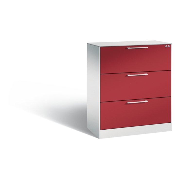 Stahl-Schubladenschrank Asisto, als Karteischrank, Korpus aus stabiler Stahlkonstruktion, körperschallgedämpft für angenehmes Geräuschverhalten, mit filigraner Kantenoptik und hochwertiger Einbrennbeschichtung für hohe UV- Beständigkeit, mit integrierter Niveauregulierung von innen bedienbar, 3 voll ausziehbare Schubladen, 4-bahnig, für Karteikarten DIN A5 hoch, mit 2 verstellbaren Pendelblechen je Bahn, auf langlebigen Teleskopschienen mit Parallelsteuerung, End-Selbst-Einzug und Auszugsperre, hohe Traglast 50 Kg je Schublade, 1 Wechselzylinder matt vernickelt mit 2 Schlüsseln, 3 Ergonomische Design-Bügelgriffe für einfache Bedienung, aus Metall, matt vernickelt, 1 selbstklebender Kunststoff-Etikettenrahmen, zur Ergänzung der beiliegenden Beschriftungsschilder, inkl. Etikett und Klarsicht-Abdeckung, Set bestehend aus 3 Stück, 1 Schubladenblenden aus Stahl, 2 Schubladenblenden aus Stahl, 1 Abdeckplatte aus Stahl, Maße (H x B x T): 1010 x 800 x 435 mm, Korpus: RAL 7035 Lichtgrau, Blenden: RAL 3003 Rubinrot, Inneneinrichtung: RAL 7021 Schwarzgrau