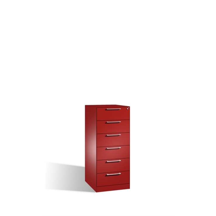 Stahl-Schubladenschrank Asisto, als Karteischrank, Korpus aus stabiler Stahlkonstruktion, körperschallgedämpft für angenehmes Geräuschverhalten, mit filigraner Kantenoptik und hochwertiger Einbrennbeschichtung für hohe UV- Beständigkeit, mit integrierter Niveauregulierung von innen bedienbar, 6 voll ausziehbare Schubladen, 2-bahnig, für Karteikarten DIN A5 quer, mit 3 verstellbaren Pendelblechen je Bahn, 1 Wechselzylinder matt vernickelt mit 2 Schlüsseln, 6 Ergonomische Design-Bügelgriffe für einfache Bedienung, aus Metall, matt vernickelt, 1 selbstklebender Kunststoff- Etikettenrahmen, zur Ergänzung der beiliegenden Beschriftungsschilder, inkl. Etikett und Klarsicht-Abdeckung, Set bestehend aus 6 Stück, 1 Schubladenblenden aus Stahl, 5 Schubladenblenden aus Stahl, 1 filigrane Stahl-Abdeckplatte, schallgedämmt Maße (H x B x T): 1310 x 562 x 600 mm, Korpus: RAL 3003 Rubinrot, Blenden: RAL 3003 Rubinrot, Inneneinrichtung: RAL 7021 Schwarzgrau