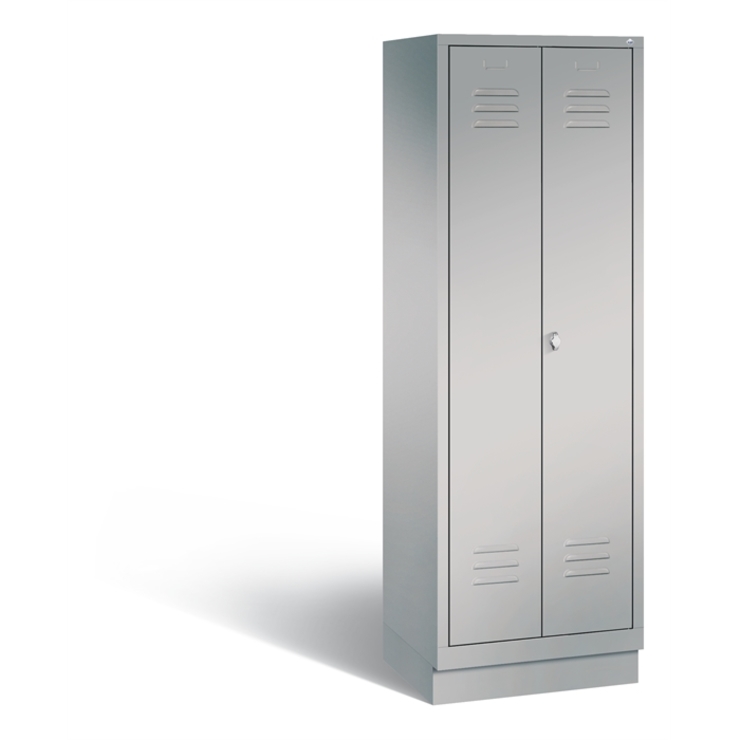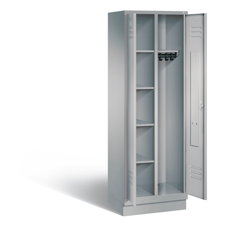 Stahl-Garderobenschrank Classic, als Mehrzweckschrank mit Mitteltrennwand, Abteilbreite 300 mm, Türen zueinanderschlagend für gemeinsamen Verschluss, Korpus aus stabiler Stahlkonstruktion mit hochwertiger Einbrennbeschichtung für hohe UV- und Korrosionsbeständigkeit, links 4 fest eingebaute Einlegeböden, rechts Ablageboden und stabile Garderobenstange aus Ovalprofil mit 3 verdrehsicheren Schiebehaken, Türen zueinanderschlagend für gemeinsamen Verschluss, auf 100 mm hohem Sockel, mit Kunststoffgleitern als praktischer Schrank- und Fußbodenschutz, vorne zurückgesetzt und oberhalb mit Luftdurchlass, 1 Drehriegel für Vorhangschloss, Türen mit Anschlagsdämpfer und mittiger Verstärkung für hohe Stabilität, mit Lüftungschlitzen oben und unten sowie eingestanztem Etikettenrahmen, Türaufhängung in Drehbolzen, Maße (H x B x T): 1800 x 610 x 500 mm, Korpus: RAL 9006 Weißaluminium, Türen Stahl: RAL 9006 Weißaluminium, Inneneinrichtung: RAL 9006 Weißaluminium