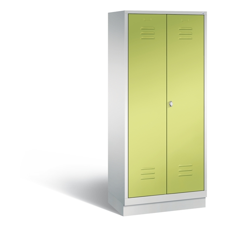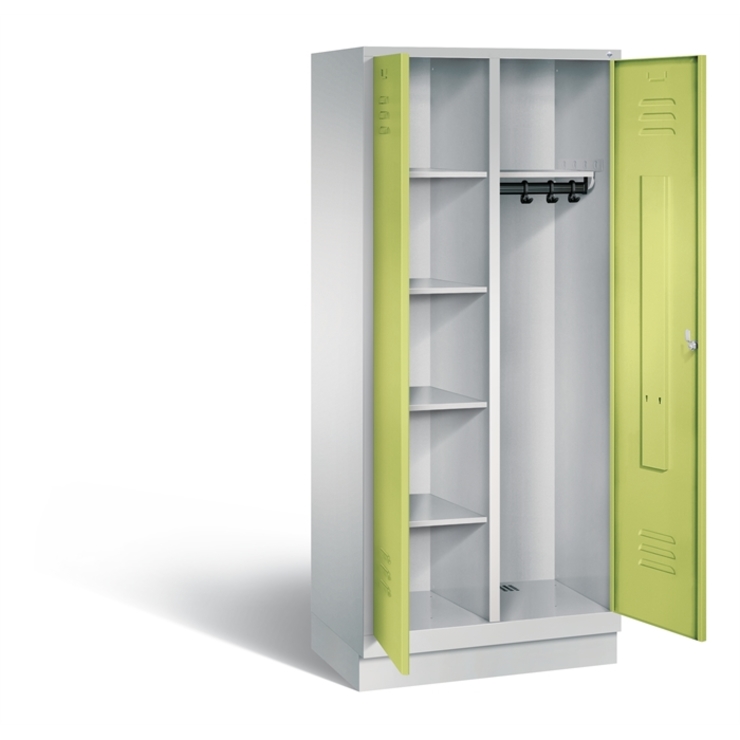 Stahl-Garderobenschrank Classic, als Mehrzweckschrank mit Mitteltrennwand, Abteilbreite 400 mm, Türen zueinanderschlagend für gemeinsamen Verschluss, Korpus aus stabiler Stahlkonstruktion mit hochwertiger Einbrennbeschichtung für hohe UV- und Korrosionsbeständigkeit, links 4 fest eingebaute Einlegeböden, rechts Ablageboden und stabile Garderobenstange aus Ovalprofil mit 3 verdrehsicheren Schiebehaken, Türen zueinanderschlagend für gemeinsamen Verschluss, auf 100 mm hohem Sockel, mit Kunststoffgleitern als praktischer Schrank- und Fußbodenschutz, vorne zurückgesetzt und oberhalb mit Luftdurchlass, 1 Drehriegel für Vorhangschloss, Türen mit Anschlagsdämpfer und mittiger Verstärkung für hohe Stabilität, mit Lüftungschlitzen oben und unten sowie eingestanztem Etikettenrahmen, Türaufhängung in Drehbolzen, Maße (H x B x T): 1800 x 810 x 500 mm, Korpus: RAL 7035 Lichtgrau, Türen Stahl: 1108060 RDS Viridingrün, Inneneinrichtung: RAL 7035 Lichtgrau