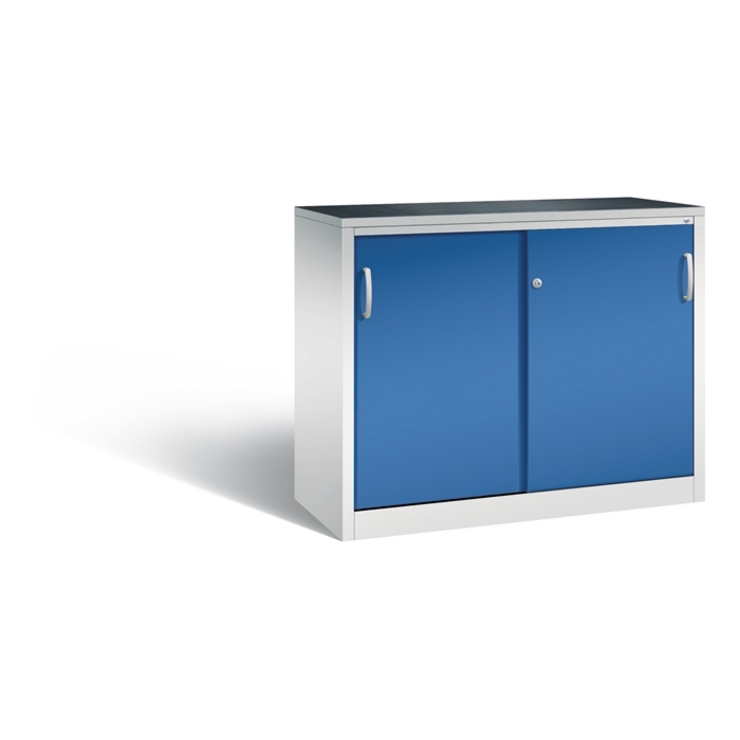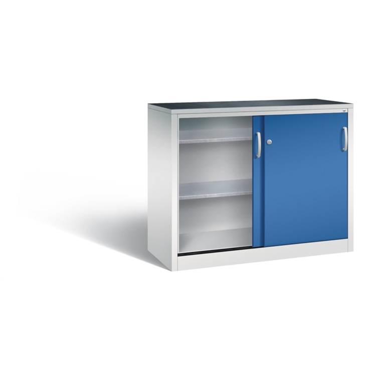 Stahl-Schiebetürenschrank Acurado-2000, Korpus aus stabiler Stahlkonstruktion mit hochwertiger Einbrennbeschichtung für hohe UV-Beständigkeit, mit Kunststoffgleitern als praktischer Schrank- und Fußbodenschutz, hohe Flexibilität der Inneneinrichtung durch Höhenverstellbarkeit im 15 mm Raster, Türen verstärkt für hohe Stabilität, leichtgängige Bedienung durch Leichtlaufrollen in spezieller Schienenführung, 1 Einlegeboden aus Stahl, verzinkt, 2 fach verstärkt, mit hoher Traglast von 110 Kg, 1 Wechselzylinder matt vernickelt mit 2 Schlüsseln, 1 inkl. Gummiriefenmatte zur Auflage auf den Schrank, selbstklebend, Maße (H x B x T): 1000 x 1200 x 500 mm, Korpus: RAL 7035 Lichtgrau, Türen: RAL 5010 Enzianblau