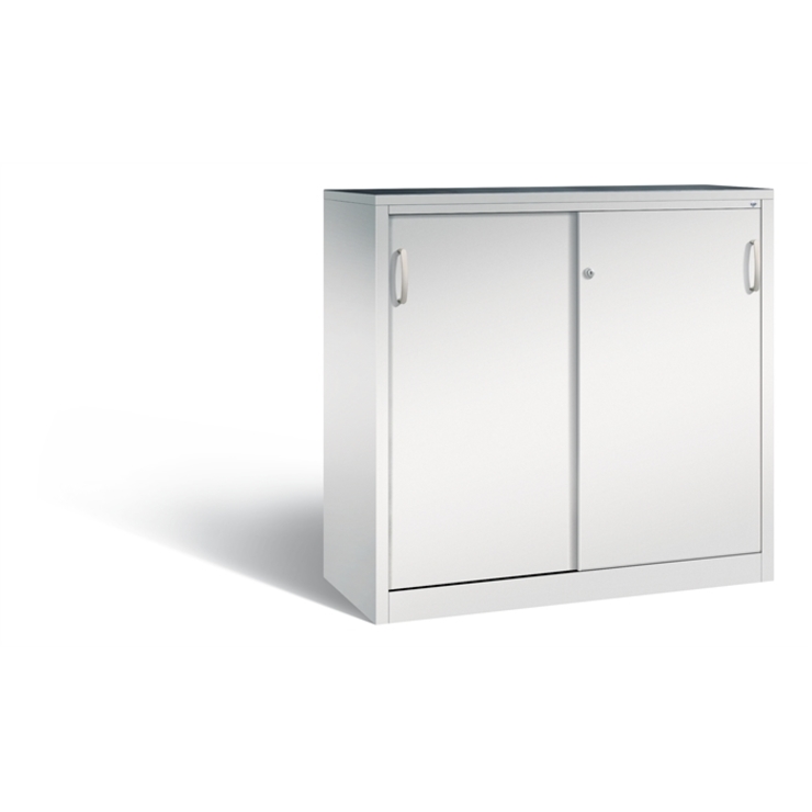 Stahl-Schiebetürenschrank Acurado-2000, Korpus aus stabiler Stahlkonstruktion mit hochwertiger Einbrennbeschichtung für hohe UV-Beständigkeit, mit Kunststoffgleitern als praktischer Schrank- und Fußbodenschutz, hohe Flexibilität der Inneneinrichtung durch Höhenverstellbarkeit im 15 mm Raster, Türen verstärkt für hohe Stabilität, leichtgängige Bedienung durch Leichtlaufrollen in spezieller Schienenführung, 2 Einlegeböden aus Stahl, verzinkt, 2 fach verstärkt, mit hoher Traglast von 110 Kg, 1 Wechselzylinder matt vernickelt mit 2 Schlüsseln, 1 inkl. Gummiriefenmatte zur Auflage auf den Schrank, selbstklebend, Maße (H x B x T): 1200 x 1200 x 500 mm, Korpus: RAL 7035 Lichtgrau, Türen: RAL 7035 Lichtgrau