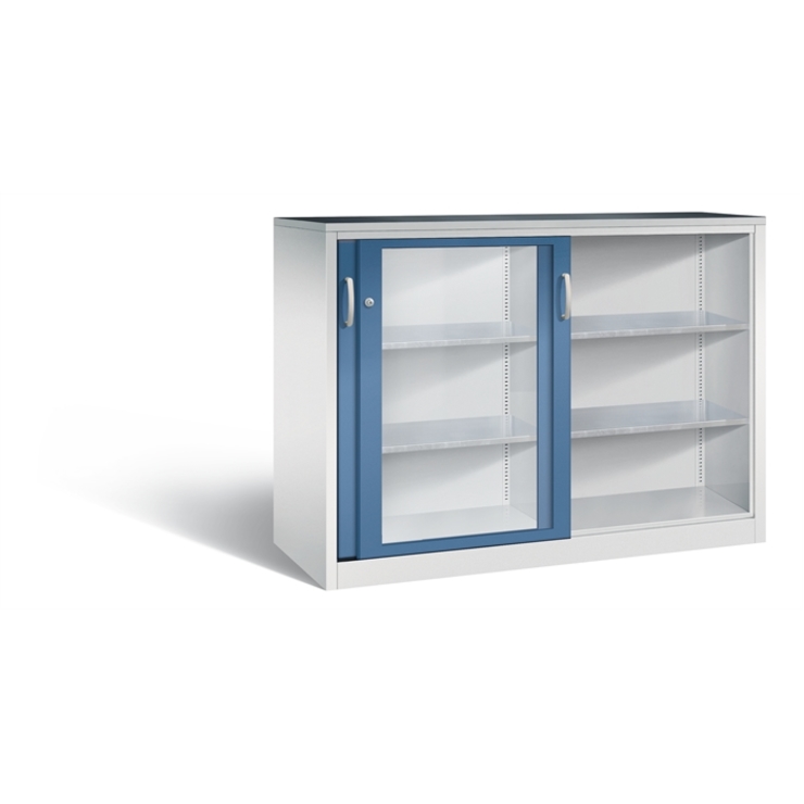 Stahl-Schiebetürenschrank Acurado-2000, Korpus aus stabiler Stahlkonstruktion mit hochwertiger Einbrennbeschichtung für hohe UV-Beständigkeit, mit Kunststoffgleitern als praktischer Schrank- und Fußbodenschutz, hohe Flexibilität der Inneneinrichtung durch Höhenverstellbarkeit im 15 mm Raster, Türen mit Sichtfenster aus Acrylglas für direkten Einblick, mit geschlossenen Seitenprofilen für höchste Stabilität, leichtgängige Bedienung durch Leichtlaufrollen in spezieller Schienenführung, 1 Wechselzylinder matt vernickelt mit 2 Schlüsseln, 2 Ergonomische Bügelgriffe Ergolock aus Metall für einfache Bedienung, matt vernickelt, 4 Einlegeböden aus Stahl, verzinkt, mit hoher Traglast 70 kg, 1 Gummiriefenmatte, Maße (H x B x T): 1200 x 1600 x 600 mm, Korpus: RAL 7035 Lichtgrau, Türen: RAL 5023 Fernblau