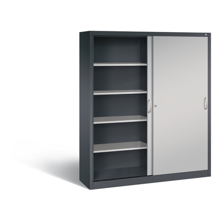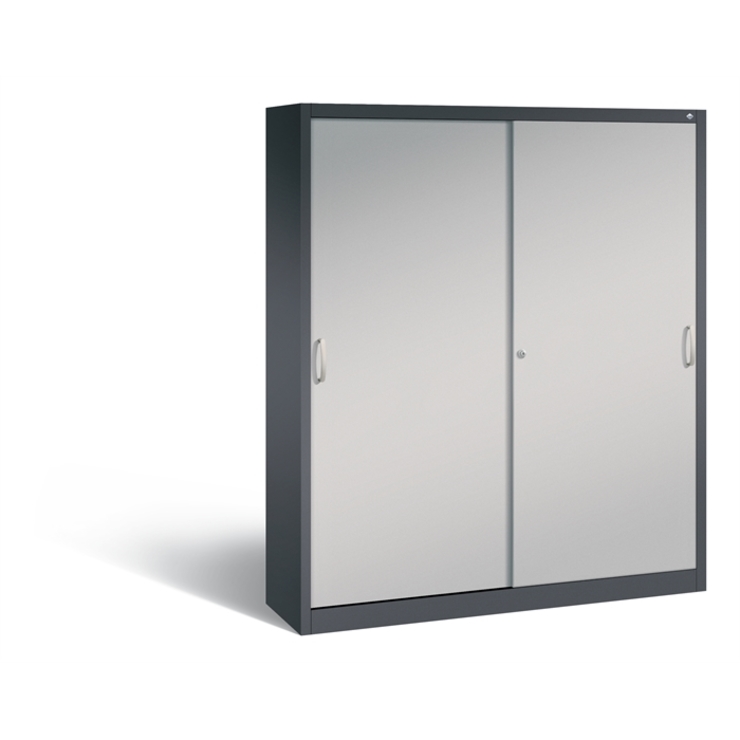Stahl-Schiebetürenschrank Acurado-2000, Korpus aus stabiler Stahlkonstruktion mit hochwertiger Einbrennbeschichtung für hohe UV-Beständigkeit, mit Kunststoffgleitern als praktischer Schrank- und Fußbodenschutz, hohe Flexibilität der Inneneinrichtung durch Höhenverstellbarkeit im 15 mm Raster, Türen verstärkt für hohe Stabilität, leichtgängige Bedienung durch Leichtlaufrollen in spezieller Schienenführung, mit Mitteltrennwand, 1 Wechselzylinder matt vernickelt mit 2 Schlüsseln, 2 Ergonomische Bügelgriffe Ergolock aus Metall für einfache Bedienung, matt vernickelt, 8 Einlegeböden aus Stahl, lackiert, mit hoher Traglast 70 kg, Maße (H x B x T): 1950 x 1600 x 400 mm, Korpus: RAL 7021 Schwarzgrau, Türen: RAL 9006 Weißaluminium, Inneneinrichtung: RAL 7035 Lichtgrau