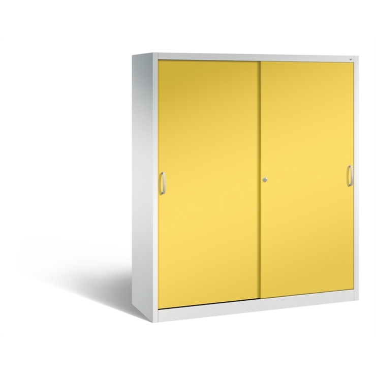 Stahl-Schiebetürenschrank Acurado-2000, Korpus aus stabiler Stahlkonstruktion mit hochwertiger Einbrennbeschichtung für hohe UV-Beständigkeit, mit Kunststoffgleitern als praktischer Schrank- und Fußbodenschutz, hohe Flexibilität der Inneneinrichtung durch Höhenverstellbarkeit im 15 mm Raster, Türen verstärkt für hohe Stabilität, leichtgängige Bedienung durch Leichtlaufrollen in spezieller Schienenführung, mit Mitteltrennwand, 1 Wechselzylinder matt vernickelt mit 2 Schlüsseln, 2 Ergonomische Bügelgriffe Ergolock aus Metall für einfache Bedienung, matt vernickelt, 12 Pendelstangen für Pendelmappen System Elba/Leitz, Maße (H x B x T): 1950 x 1600 x 500 mm, Korpus: RAL 7035 Lichtgrau, Türen: 0808060 RDS Sonnengelb, Inneneinrichtung: RAL 7035 Lichtgrau