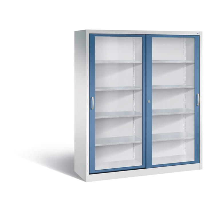 Stahl-Schiebetürenschrank Acurado-2000, Korpus aus stabiler Stahlkonstruktion mit hochwertiger Einbrennbeschichtung für hohe UV-Beständigkeit, mit Kunststoffgleitern als praktischer Schrank- und Fußbodenschutz, hohe Flexibilität der Inneneinrichtung durch Höhenverstellbarkeit im 15 mm Raster, Türen mit Sichtfenster aus Acrylglas für direkten Einblick, mit geschlossenen Seitenprofilen für höchste Stabilität, leichtgängige Bedienung durch Leichtlaufrollen in spezieller Schienenführung, 1 Wechselzylinder matt vernickelt mit 2 Schlüsseln, 2 Ergonomische Bügelgriffe Ergolock aus Metall für einfache Bedienung, matt vernickelt, 8 Einlegeböden aus Stahl, verzinkt, mit hoher Traglast 70 kg, Maße (H x B x T): 1950 x 1600 x 500 mm, Korpus: RAL 7035 Lichtgrau, Türen: RAL 5023 Fernblau