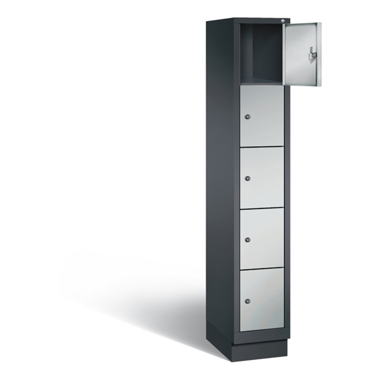Stahl-Fächerschrank Classic, 1 Abteil mit 5 Fächern, Abteilbreite 300 mm, Korpus aus stabiler Stahlkonstruktion mit hochwertiger Einbrennbeschichtung für hohe UV- und Korrosionsbeständigkeit, auf 100 mm hohem Sockel, mit Kunststoffgleitern als praktischer Schrank- und Fußbodenschutz, vorne zurückgesetzt, 5 Zylinderschlösser mit je 2 Schlüsseln, Schließkreis bis 1000 verschiedene Schließungen, Türen mit Anschlagsdämpfer, Türaufhängung in Drehbolzen, Maße (H x B x T): 1800 x 320 x 500 mm, Korpus: RAL 7021 Schwarzgrau, Türen Stahl: RAL 9006 Weißaluminium