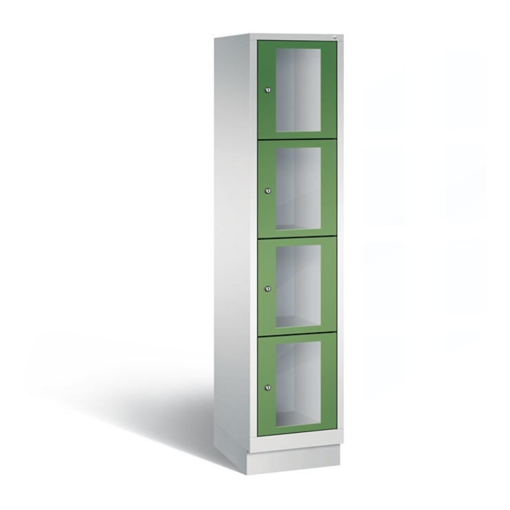 Stahl-Fächerschrank Classic, 1 Abteil mit 4 Fächern, Abteilbreite 400 mm, Korpus aus stabiler Stahlkonstruktion mit hochwertiger Einbrennbeschichtung für hohe UV- und Korrosionsbeständigkeit, auf 100 mm hohem Sockel, mit Kunststoffgleitern als praktischer Schrank- und Fußbodenschutz, vorne zurückgesetzt, 4 Zylinderschlösser mit je 2 Schlüsseln, Schließkreis bis 1000 verschiedene Schließungen, 1 Türen mit Sichtfenster aus Acrylglas für direkten Einblick, Türaufhängung in Drehbolzen mit Öffnungswinkel von ca. 110 Grad, inkl. Anschlagsdämpfer für angenehmes Schließverhalten, Maße (H x B x T): 1800 x 420 x 500 mm, Korpus: RAL 7035 Lichtgrau, Türen Stahl: RAL 6011 Resedagrün