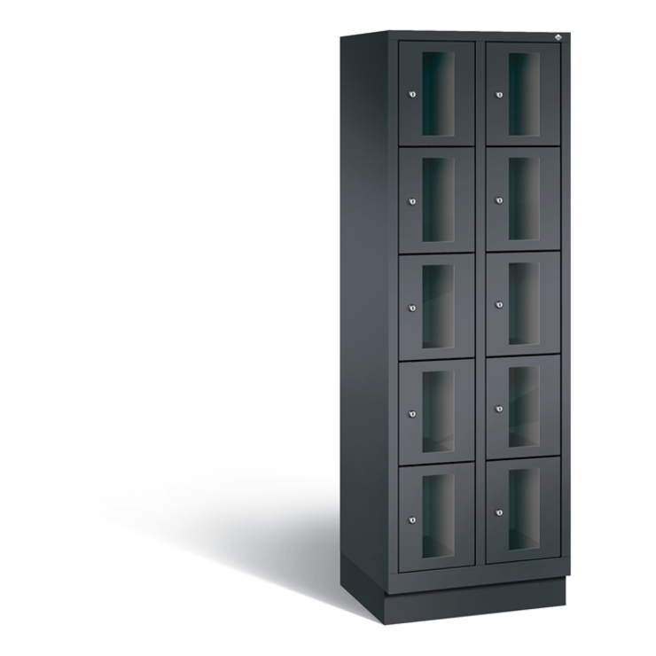 Stahl-Fächerschrank Classic, 2 Abteile mit 5 Fächern, Abteilbreite 300 mm, Korpus aus stabiler Stahlkonstruktion mit hochwertiger Einbrennbeschichtung für hohe UV- und Korrosionsbeständigkeit, auf 100 mm hohem Sockel, mit Kunststoffgleitern als praktischer Schrank- und Fußbodenschutz, vorne zurückgesetzt, 10 Zylinderschlösser mit je 2 Schlüsseln, Schließkreis bis 1000 verschiedene Schließungen, 1 Türen mit Sichtfenster aus Acrylglas für direkten Einblick, Türaufhängung in Drehbolzen mit Öffnungswinkel von ca. 110 Grad, inkl. Anschlagsdämpfer für angenehmes Schließverhalten, Maße (H x B x T): 1800 x 610 x 500 mm, Korpus: RAL 7021 Schwarzgrau, Türen Stahl: RAL 7021 Schwarzgrau