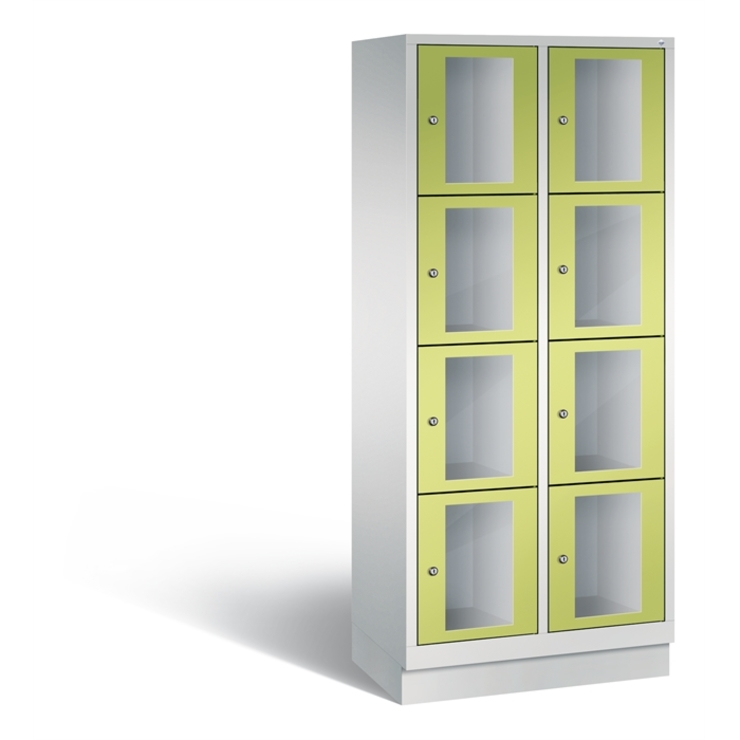 Stahl-Fächerschrank Classic, 2 Abteile mit 4 Fächern, Abteilbreite 400 mm, Korpus aus stabiler Stahlkonstruktion mit hochwertiger Einbrennbeschichtung für hohe UV- und Korrosionsbeständigkeit, auf 100 mm hohem Sockel, mit Kunststoffgleitern als praktischer Schrank- und Fußbodenschutz, vorne zurückgesetzt, 8 Zylinderschlösser mit je 2 Schlüsseln, Schließkreis bis 1000 verschiedene Schließungen, 1 Türen mit Sichtfenster aus Acrylglas für direkten Einblick, Türaufhängung in Drehbolzen mit Öffnungswinkel von ca. 110 Grad, inkl. Anschlagsdämpfer für angenehmes Schließverhalten, Maße (H x B x T): 1800 x 810 x 500 mm, Korpus: RAL 7035 Lichtgrau, Türen Stahl: 1108060 RDS Viridingrün