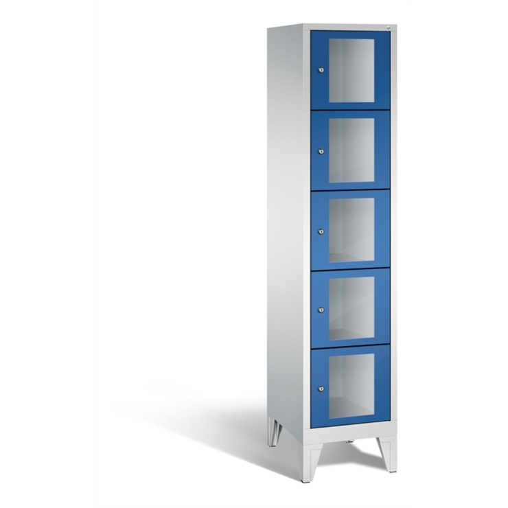 Stahl-Fächerschrank Classic, 1 Abteil mit 5 Fächern, Abteilbreite 400 mm, Korpus aus stabiler Stahlkonstruktion mit hochwertiger Einbrennbeschichtung für hohe UV- und Korrosionsbeständigkeit, auf 150 mm hohen Füßen aus Kunststoff für erweiterten Korrosionsschutz, 5 Zylinderschlösser mit je 2 Schlüsseln, Schließkreis bis 1000 verschiedene Schließungen, 1 Türen mit Sichtfenster aus Acrylglas für direkten Einblick, Türaufhängung in Drehbolzen mit Öffnungswinkel von ca. 110 Grad, inkl. Anschlagsdämpfer für angenehmes Schließverhalten, Maße (H x B x T): 1850 x 420 x 500 mm, Korpus: RAL 7035 Lichtgrau, Türen Stahl: RAL 5010 Enzianblau, Füße: RAL 7035 Lichtgrau