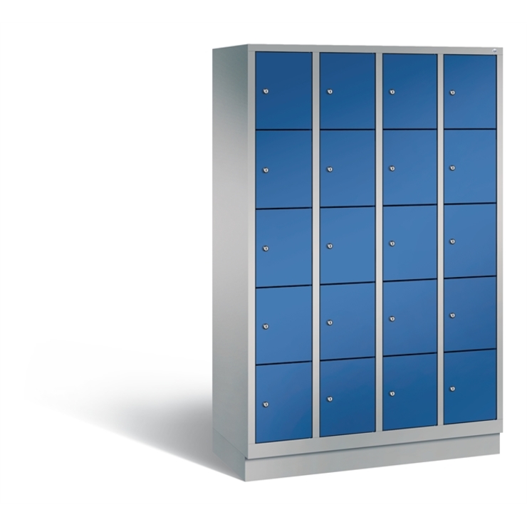 Stahl-Fächerschrank Evolo, 4 Abteile mit je 5 Fächern, Abteilbreite 300 mm, Korpus aus stabiler Stahlkonstruktion mit hochwertiger Einbrennbeschichtung für hohe UV- und Korrosionsbeständigkeit, auf 100 mm hohem Sockel, mit Kunststoffgleitern als praktischer Schrank- und Fußbodenschutz, vorne zurückgesetzt, 20 Zylinderschlösser mit je 2 Schlüsseln, Schließkreis bis 1000 verschiedene Schließungen, Türen mit Anschlagsdämpfer, Türaufhängung in Drehbolzen, Maße (H x B x T): 1800 x 1190 x 500 mm, Korpus: RAL 9006 Weißaluminium, Türen Stahl: RAL 5010 Enzianblau