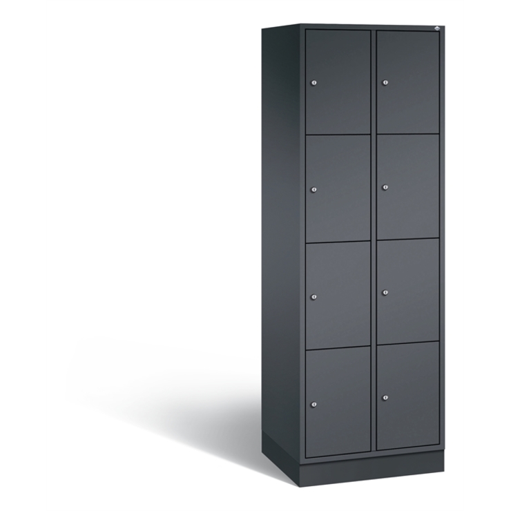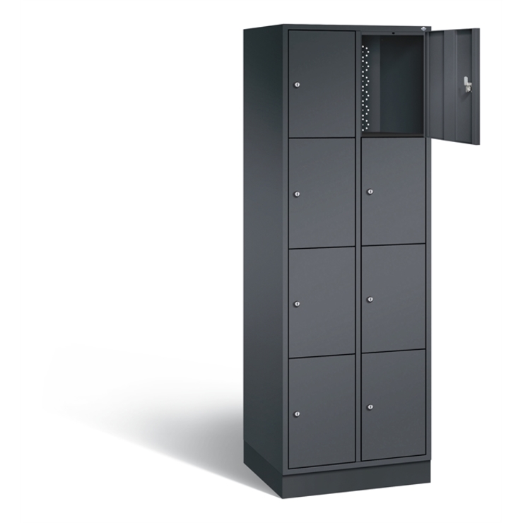 Stahl-Schließfachschrank Intro, 2 Abteile mit 4 Fächern, Abteilbreite 300 mm, Korpus aus stabiler Stahlkonstruktion mit hochwertiger Einbrennbeschichtung für hohe UV- und Korrosionsbeständigkeit, Türen doppelwandig für hohe Stabilität, mit Anschlagsdämpfer, Türaufhängung durchgängig mit robustem Scharnierband, rechts angeschlagen, Rückwand mit großflächigem Luftdurchlass und 18 mm Wandabstandshaltern, auf 100 mm hohem Sockel, 8 Zylinderschlösser mit je 2 Schlüsseln, Schließkreis bis 1000 verschiedene Schließungen, Maße (H x B x T): 1950 x 620 x 490 mm, Korpus: RAL 7021 Schwarzgrau, Türen: RAL 7021 Schwarzgrau, Sockel: RAL 7021 Schwarzgrau