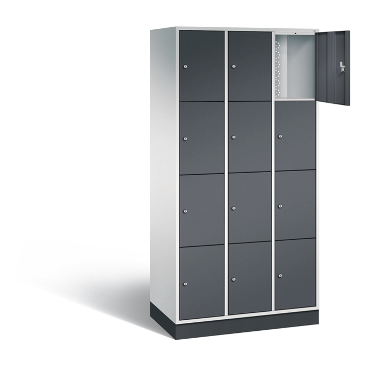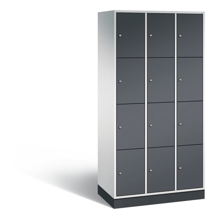 Stahl-Schließfachschrank Intro, 3 Abteile mit 4 Fächern, Abteilbreite 300 mm, Korpus aus stabiler Stahlkonstruktion mit hochwertiger Einbrennbeschichtung für hohe UV- und Korrosionsbeständigkeit, Türen doppelwandig für hohe Stabilität, mit Anschlagsdämpfer, Türaufhängung durchgängig mit robustem Scharnierband, rechts angeschlagen, Rückwand mit großflächigem Luftdurchlass und 18 mm Wandabstandshaltern, auf 100 mm hohem Sockel, 12 Zylinderschlösser mit je 2 Schlüsseln, Schließkreis bis 1000 verschiedene Schließungen, Maße (H x B x T): 1950 x 920 x 490 mm, Korpus: RAL 7035 Lichtgrau, Türen: RAL 7021 Schwarzgrau, Sockel: RAL 7021 Schwarzgrau