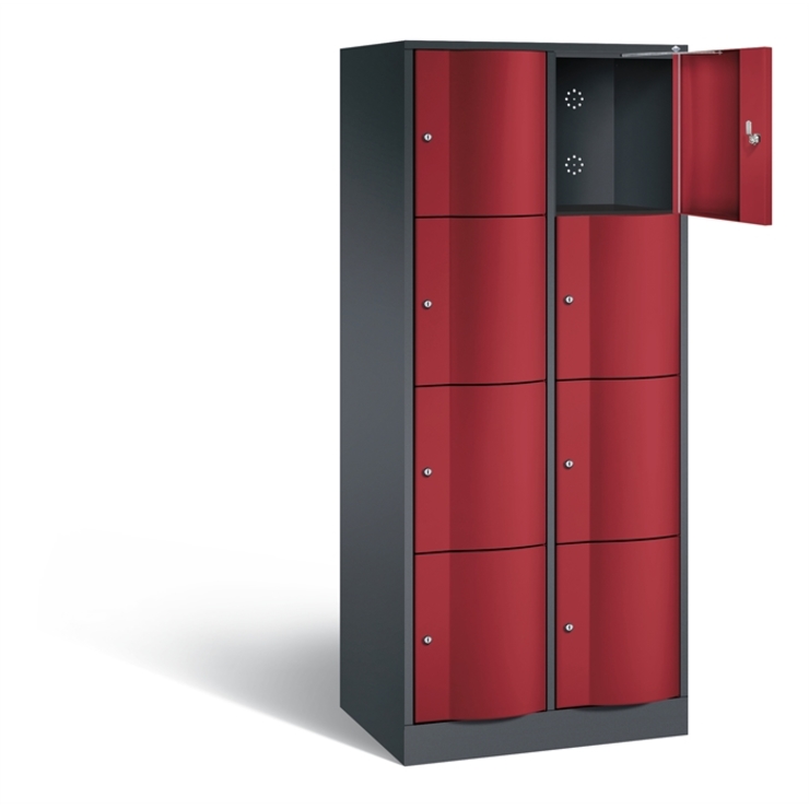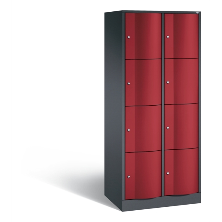 Stahl-Schließfachschrank Resisto, 2 Abteile mit je 4 Fächern, Korpus aus stabiler Stahlkonstruktion mit hochwertiger Einbrennbeschichtung für hohe UV- und Korrosionsbeständigkeit, Spezialtüren aus 1,5 mm Stahl, mit Wölbung nach vorne, absolut stabil und vandalismussicher, mit Anschlagsdämpfer, Türaufhängung durchgängig mit robustem Drehstangen- Scharnier, rechts angeschlagen, Rückwand mit großflächigem Luftdurchlass und 18 mm Wandabstandshaltern, auf 100 mm hohem Sockel mit 30 mm Niveauregulierung, 8 Drehzylinderschlösser mit 2 Schlüsseln, Schließkreis bis 6000 verschiedene Schließungen, Maße (H x B x T): 1950 x 772 x 540 mm, Korpus: RAL 7021 Schwarzgrau, Türen: RAL 3003 Rubinrot