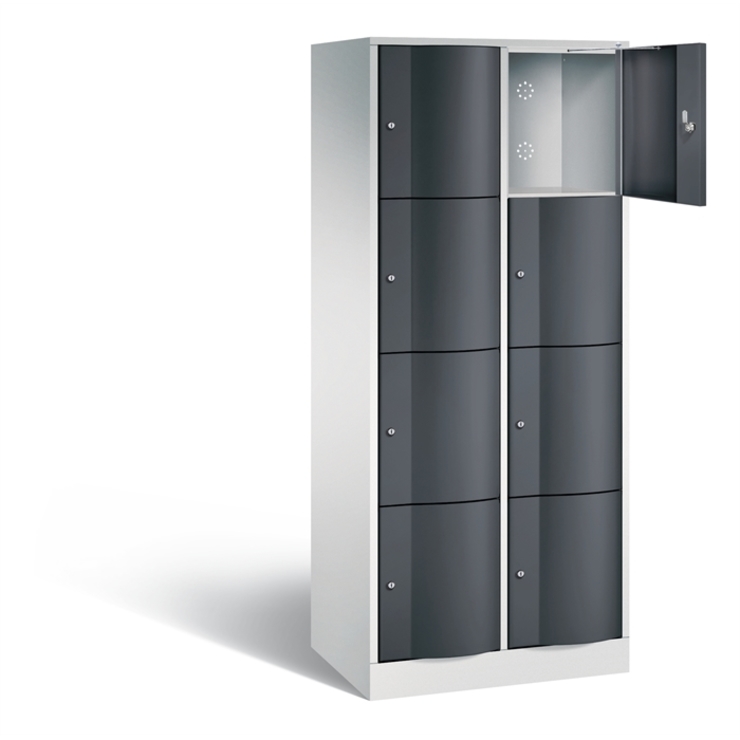 Stahl-Schließfachschrank Resisto, 2 Abteile mit je 4 Fächern, Korpus aus stabiler Stahlkonstruktion mit hochwertiger Einbrennbeschichtung für hohe UV- und Korrosionsbeständigkeit, Spezialtüren aus 1,5 mm Stahl, mit Wölbung nach vorne, absolut stabil und vandalismussicher, mit Anschlagsdämpfer, Türaufhängung durchgängig mit robustem Drehstangen- Scharnier, rechts angeschlagen, Rückwand mit großflächigem Luftdurchlass und 18 mm Wandabstandshaltern, auf 100 mm hohem Sockel mit 30 mm Niveauregulierung, 8 Drehzylinderschlösser mit 2 Schlüsseln, Schließkreis bis 6000 verschiedene Schließungen, Maße (H x B x T): 1950 x 772 x 540 mm, Korpus: RAL 7035 Lichtgrau, Türen: RAL 7021 Schwarzgrau