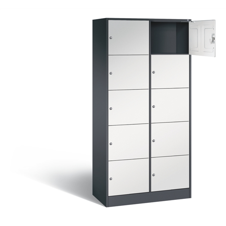 Stahl-Fächerschrank Serie 8070, XL, 2 Abteile mit je 5 Fächern, Korpus aus stabiler Stahlkonstruktion mit hochwertiger Einbrennbeschichtung für hohe UV- und Korrosionsbeständigkeit, Türen doppelwandig für hohe Stabilität, Türaufhängung oben und unten in Drehbolzen, rechts angeschlagen, inkl. Türöffnungsbegrenzer 90 Grad, als Schutz vor Überdehnen der Tür, auf 100 mm hohem Sockel, 10 Zylinderschlösser mit je 2 Schlüsseln, Schließkreis bis 1000 verschiedene Schließungen, Maße (H x B x T): 1950 x 900 x 480 mm, Korpus: RAL 7021 Schwarzgrau, Türen: RAL 7035 Lichtgrau