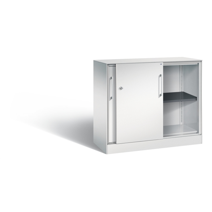Stahl-Schiebetürenschrank Asisto, Korpus aus stabiler Stahlkonstruktion mit filigraner Kantenoptik und hochwertiger Einbrennbeschichtung für hohe UV-Beständigkeit, mit integrierter Niveauregulierung, bequem von innen bedienbar, hohe Flexibilität der Inneneinrichtung durch Höhenverstellbarkeit im 15 mm Raster, 1 Wechselzylinder matt vernickelt mit 2 Schlüsseln, 2 Ergonomische Design-Bügelgriffe für einfache Bedienung, aus Metall, matt vernickelt, 1 Abdeckplatte aus Stahl, 2 Stahltüren... (mehr)? Papersmart hilft Ihnen, den besten Anbieter für Ihren gesamten Warenkorb zu ermitteln.