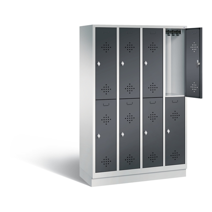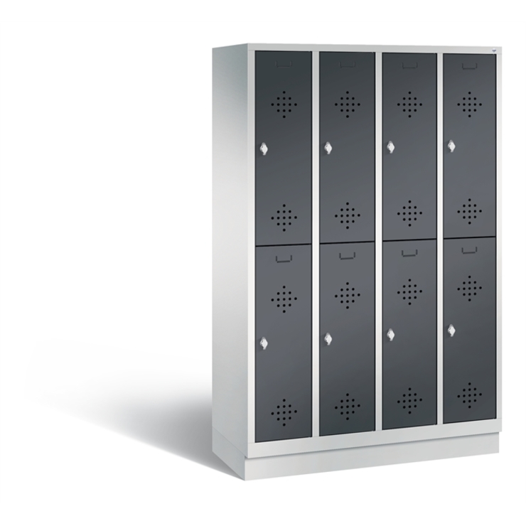 Doppelstöckiger Stahl-Garderobenschrank Classic, 4 Abteile mit 2 Fächern, Abteilbreite 300 mm, Korpus aus stabiler Stahlkonstruktion mit hochwertiger Einbrennbeschichtung für hohe UV- und Korrosionsbeständigkeit, innen je Fach 1 stabile Garderobenstange aus Ovalprofil mit 3 verdrehsicheren Schiebehaken, auf 100 mm hohem Sockel, mit Kunststoffgleitern als praktischer Schrank- und Fußbodenschutz, vorne zurückgesetzt, 8 Drehriegel für Vorhängeschlösser, 8 Türen mit Anschlagsdämpfer und mittiger Verstärkung für hohe Stabilität, mit reinigungsfreundlichem Belüftungslochbild oben und unten sowie eingeprägtem Etikettenrahmen, Türaufhängung in Drehbolzen, Maße (H x B x T): 1800 x 1190 x 500 mm, Korpus: RAL 7035 Lichtgrau, Türen Stahl: RAL 7021 Schwarzgrau