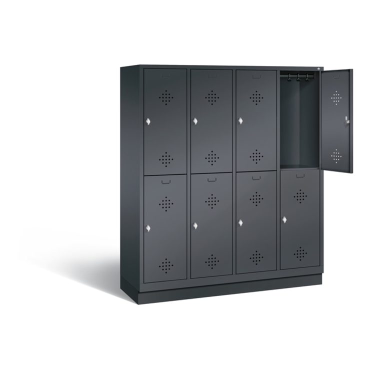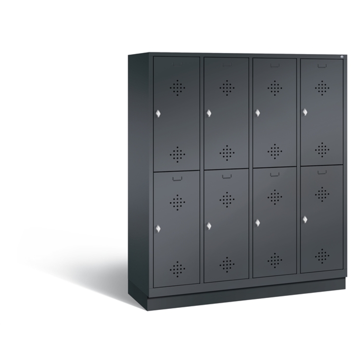 Doppelstöckiger Stahl-Garderobenschrank Classic, 4 Abteile mit 2 Fächern, Abteilbreite 400 mm, Korpus aus stabiler Stahlkonstruktion mit hochwertiger Einbrennbeschichtung für hohe UV- und Korrosionsbeständigkeit, innen je Fach 1 stabile Garderobenstange aus Ovalprofil mit 3 verdrehsicheren Schiebehaken, auf 100 mm hohem Sockel, mit Kunststoffgleitern als praktischer Schrank- und Fußbodenschutz, vorne zurückgesetzt, 8 Drehriegel für Vorhängeschlösser, 8 Türen mit Anschlagsdämpfer und mittiger Verstärkung für hohe Stabilität, mit reinigungsfreundlichem Belüftungslochbild oben und unten sowie eingeprägtem Etikettenrahmen, Türaufhängung in Drehbolzen, Maße (H x B x T): 1800 x 1590 x 500 mm, Korpus: RAL 7021 Schwarzgrau, Türen Stahl: RAL 7021 Schwarzgrau