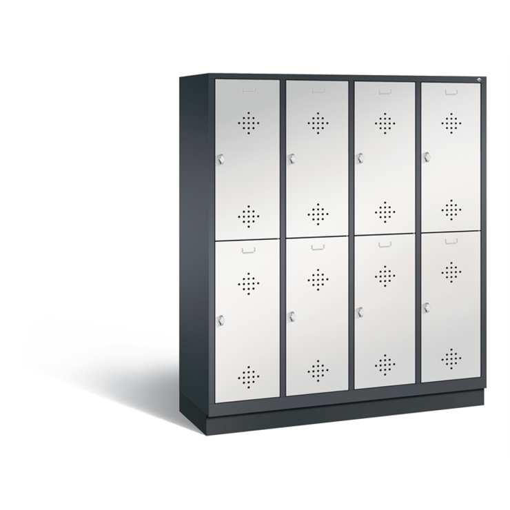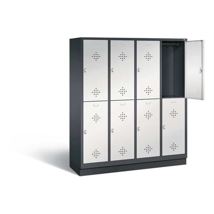 Doppelstöckiger Stahl-Garderobenschrank Evolo, 4 Abteile mit je 2 Fächern, Abteilbreite 400 mm, Korpus aus stabiler Stahlkonstruktion mit hochwertiger Einbrennbeschichtung für hohe UV- und Korrosionsbeständigkeit, innen je Fach 1 stabile Garderobenstange aus Ovalprofil mit 3 verdrehsicheren Schiebehaken, auf 150 mm hohen Füßen aus Kunststoff für erweiterten Korrosionsschutz, mit integrierter Niveauregulierung und Schutzhülsen zur stilvollen Abdeckung der Verstellschrauben, bequem von... (mehr)? Papersmart hilft Ihnen, den besten Anbieter für Ihren gesamten Warenkorb zu ermitteln.