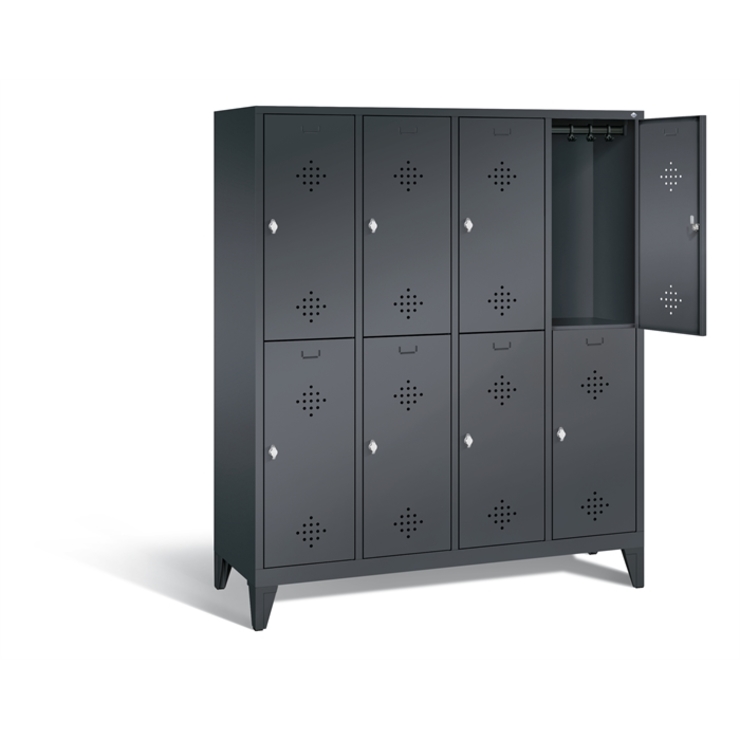Doppelstöckiger Stahl-Garderobenschrank Classic, 4 Abteile mit 2 Fächern, Abteilbreite 300 mm, Korpus aus stabiler Stahlkonstruktion mit hochwertiger Einbrennbeschichtung für hohe UV- und Korrosionsbeständigkeit, innen je Fach 1 stabile Garderobenstange aus Ovalprofil mit 3 verdrehsicheren Schiebehaken, auf 100 mm hohem Sockel, mit Kunststoffgleitern als praktischer Schrank- und Fußbodenschutz, vorne zurückgesetzt, 8 Drehriegel für Vorhängeschlösser, 8 Türen mit Anschlagsdämpfer und... (mehr)? Papersmart hilft Ihnen, den besten Anbieter für Ihren gesamten Warenkorb zu ermitteln.