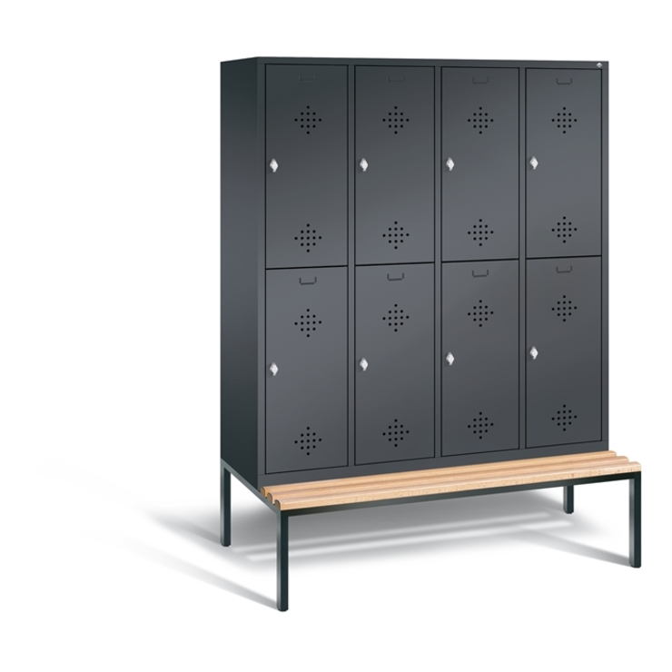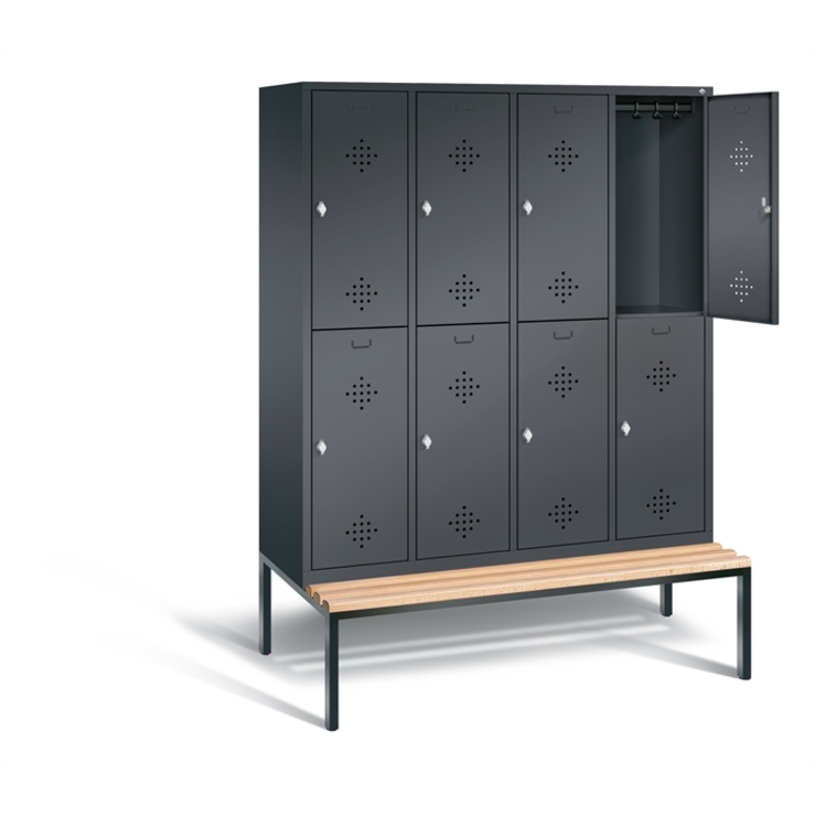 Doppelstöckiger Stahl-Garderobenschrank Classic, 4 Abteile mit je 2 Fächern, Abteilbreite 400 mm, Korpus aus stabiler Stahlkonstruktion mit hochwertiger Einbrennbeschichtung für hohe UV- und Korrosionsbeständigkeit, innen je Fach 1 Ablageboden, darunter 1 stabile Garderobenstange aus Ovalprofil mit 3 verdrehsicheren Schiebehaken, auf untergebauter Sitzbank, Gestell aus stabilem Vierkant-Stahlrohr 30 x 30 mm, mit verstellbaren Bodengleitern für einfachen Niveauausgleich, 8 Drehriegel für Vorhängeschlösser, 8 Türen mit Anschlagsdämpfer und mittiger Verstärkung für hohe Stabilität, mit reinigungsfreundlichem Belüftungslochbild oben und unten sowie eingeprägtem Etikettenrahmen, Türaufhängung in Drehbolzen, 1 Sitzleisten aus Buche-Hartholz, im Profil ca. 60 x 30 mm, allseitig gehobelt, oben abgerundet für guten Sitzkomfort, klarlackiert mit naturgegebenen Farbunterschieden, 1 Maße (H x B x T): 2090 x 1590 x 815 mm, Korpus: RAL 7021 Schwarzgrau, Türen Stahl: RAL 7021 Schwarzgrau, Gestell: RAL 7021 Schwarzgrau