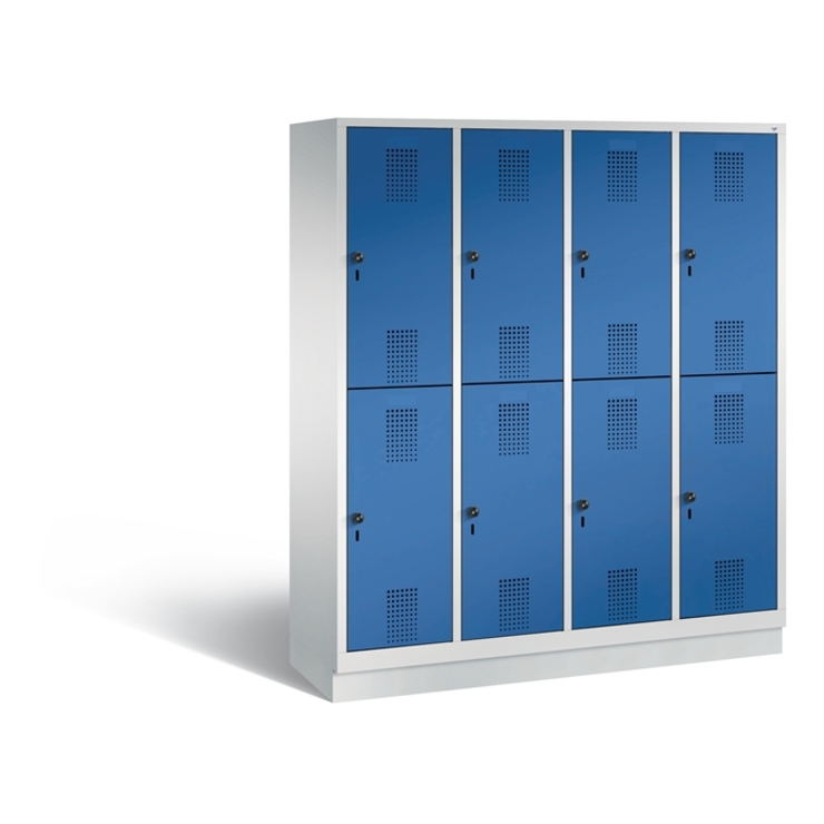 Doppelstöckiger Stahl-Garderobenschrank Evolo, 4 Abteile mit je 2 Fächern, Abteilbreite 400 mm, Korpus aus stabiler Stahlkonstruktion mit hochwertiger Einbrennbeschichtung für hohe UV- und Korrosionsbeständigkeit, innen je Fach 1 stabile Garderobenstange aus Ovalprofil mit 3 verdrehsicheren Schiebehaken, auf 100 mm hohem Sockel, mit Kunststoffgleitern als praktischer Schrank- und Fußbodenschutz, vorne zurückgesetzt, 8 Ergonomische Sicherheits-Drehriegel für Vorhängeschlösser inkl. Tür-Schutz, Türen mit Anschlagsdämpfer und geschlossenen Seitenprofilen für höchste Stabilität und Einbruchsicherheit, mit reinigungsfreundlichem Belüftungslochbild oben und unten sowie eingeprägtem Etikettenrahmen, Türaufhängung in Drehbolzen, Maße (H x B x T): 1800 x 1590 x 500 mm, Korpus: RAL 7035 Lichtgrau, Türen Stahl: RAL 5010 Enzianblau