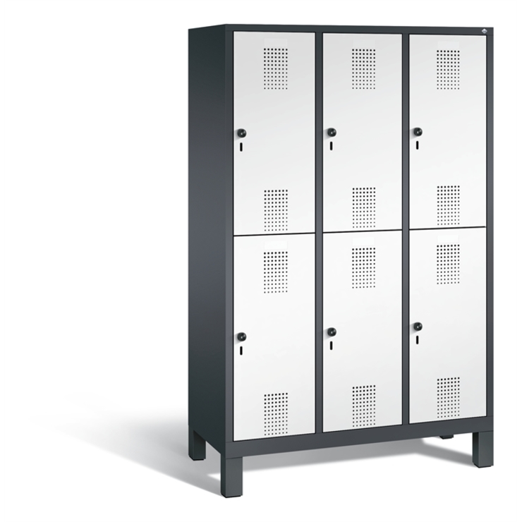 Doppelstöckiger Stahl-Garderobenschrank Evolo, 3 Abteile mit je 2 Fächern, Abteilbreite 400 mm, Korpus aus stabiler Stahlkonstruktion mit hochwertiger Einbrennbeschichtung für hohe UV- und Korrosionsbeständigkeit, innen je Fach 1 stabile Garderobenstange aus Ovalprofil mit 3 verdrehsicheren Schiebehaken, auf 150 mm hohen Füßen aus Kunststoff für erweiterten Korrosionsschutz, mit integrierter Niveauregulierung und Schutzhülsen zur stilvollen Abdeckung der Verstellschrauben, bequem von innen und außen verstellbar, 6 Ergonomische Sicherheits-Drehriegel für Vorhängeschlösser inkl. Tür-Schutz, Türen mit Anschlagsdämpfer und geschlossenen Seitenprofilen für höchste Stabilität und Einbruchsicherheit, mit reinigungsfreundlichem Belüftungslochbild oben und unten sowie eingeprägtem Etikettenrahmen, Türaufhängung in Drehbolzen, Maße (H x B x T): 1850 x 1200 x 500 mm, Korpus: RAL 7021 Schwarzgrau, Türen Stahl: RAL 9016 Verkehrsweiß, Füße: RAL 9005 Tiefschwarz