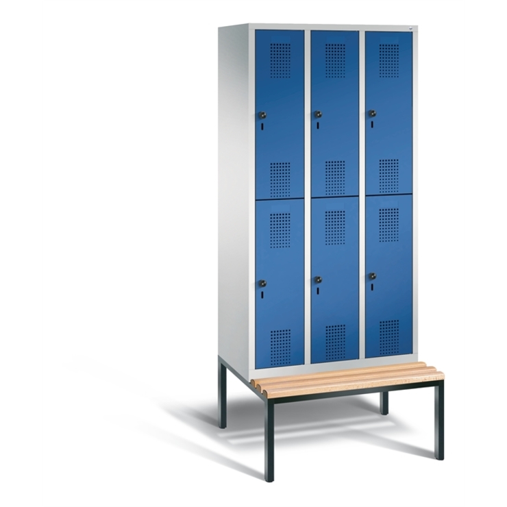 Doppelstöckiger Stahl-Garderobenschrank Evolo, 3 Abteile mit je 2 Fächern, Abteilbreite 300 mm, Korpus aus stabiler Stahlkonstruktion mit hochwertiger Einbrennbeschichtung für hohe UV- und Korrosionsbeständigkeit, innen je Fach 1 Ablageboden, darunter 1 stabile Garderobenstange aus Ovalprofil mit 3 verdrehsicheren Schiebehaken, auf untergebauter Sitzbank, Gestell aus stabilem Vierkant-Stahlrohr 30 x 30 mm, mit verstellbaren Bodengleitern für einfachen Niveauausgleich, 6 Ergonomische Sicherheits-Drehriegel für Vorhängeschlösser inkl. Tür-Schutz, Türen mit Anschlagsdämpfer und geschlossenen Seitenprofilen für höchste Stabilität und Einbruchsicherheit, mit reinigungsfreundlichem Belüftungslochbild oben und unten sowie eingeprägtem Etikettenrahmen, Türaufhängung in Drehbolzen, 1 Sitzleisten aus Buche-Hartholz, im Profil ca. 60 x 30 mm, allseitig gehobelt, oben abgerundet für guten Sitzkomfort, klarlackiert mit naturgegebenen Farbunterschieden, 1 Maße (H x B x T): 2090 x 900 x 815 mm, Korpus: RAL 7035 Lichtgrau, Türen Stahl: RAL 5010 Enzianblau, Gestell: RAL 7021 Schwarzgrau
