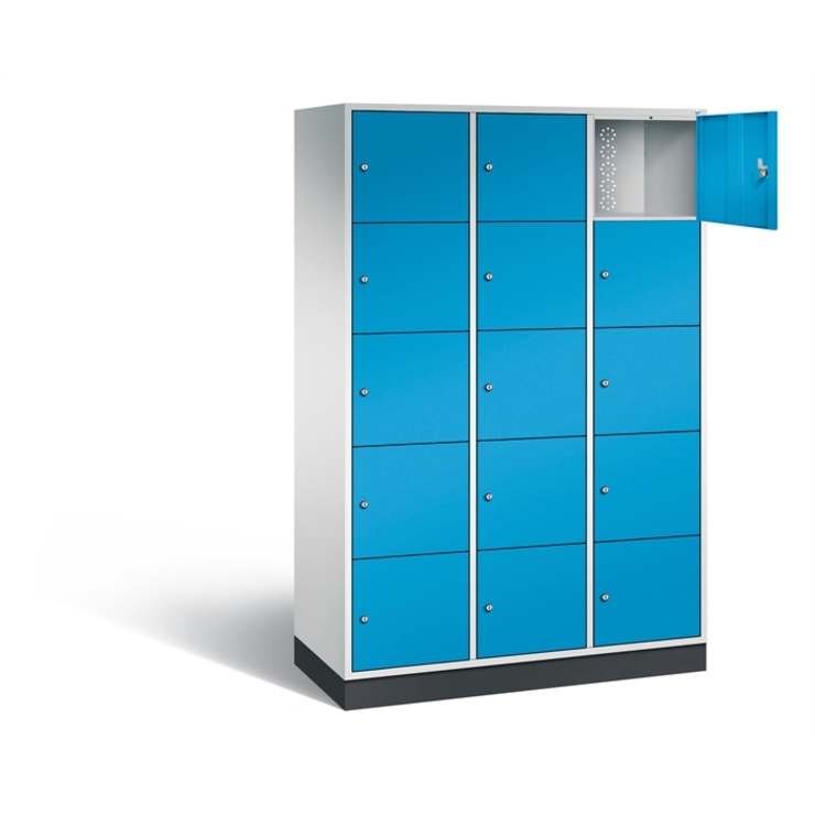 Stahl-Schließfachschrank Intro, XL, 3 Abteile mit 5 Fächern, Abteilbreite 400 mm, Korpus aus stabiler Stahlkonstruktion mit hochwertiger Einbrennbeschichtung für hohe UV- und Korrosionsbeständigkeit, Türen doppelwandig für hohe Stabilität, mit Anschlagsdämpfer, Türaufhängung durchgängig mit robustem Scharnierband, rechts angeschlagen, Rückwand mit großflächigem Luftdurchlass und 18 mm Wandabstandshaltern, auf 100 mm hohem Sockel, 15 Zylinderschlösser mit je 2 Schlüsseln, Schließkreis bis 1000 verschiedene Schließungen, Maße (H x B x T): 1950 x 1220 x 490 mm, Korpus: RAL 7035 Lichtgrau, Türen: RAL 5012 Lichtblau, Sockel: RAL 7021 Schwarzgrau